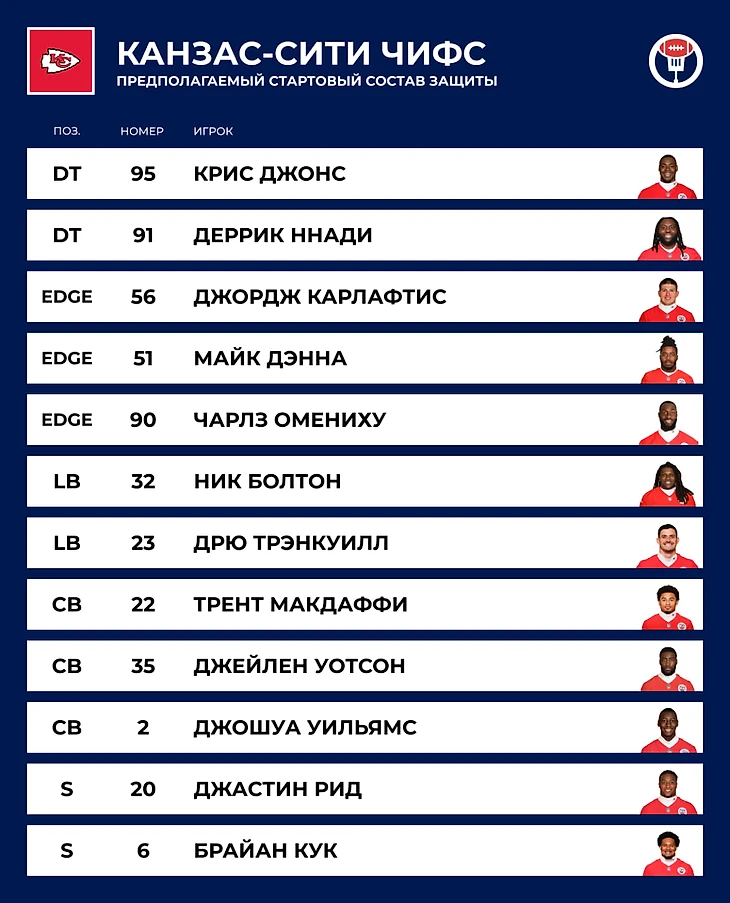 🦶 Слабость: Тэклы нападения. «Чифс» попытались решить проблему в прошлое межсезонье, подписав Донована Смита и Джаваана Тейлора — второго на очень большие деньги. Провалились оба. Тейлор заработал 23 нарушения за сезон, у ближайшего преследователя в этой сомнительной номинации только 18 флагов. Смита в команде уже нет, но его сменщики пока не вызывают доверия, а Тейлор всё там же.