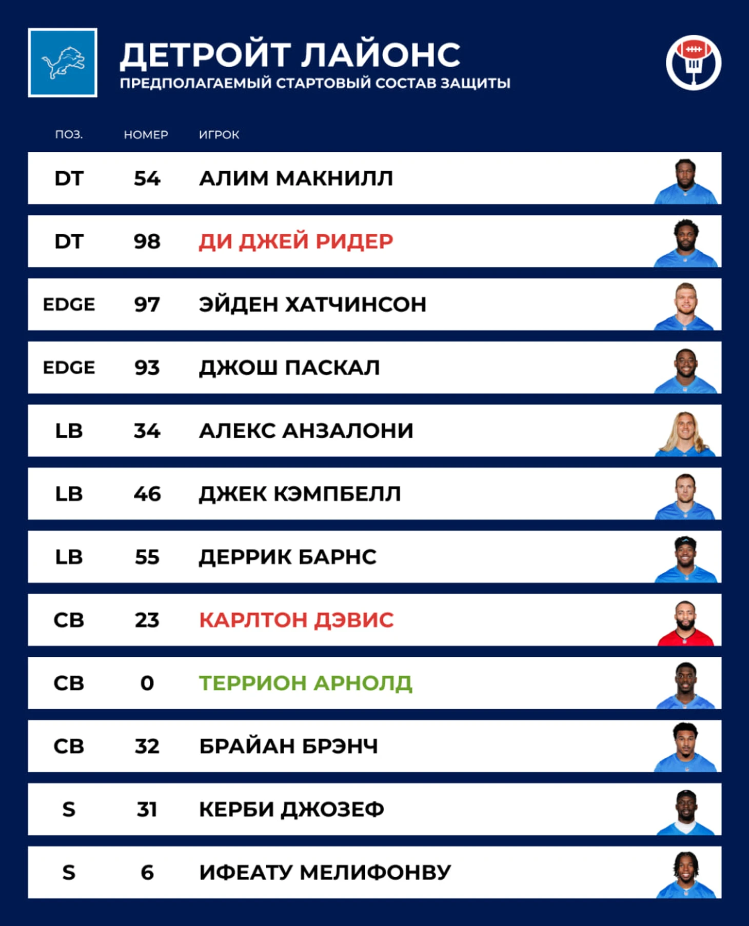 👔 Тренер: Дэн Кэмпбелл. Здоровенный детина, бывший тайт-энд, архетипичный Хороший Мужик, который живёт футболом. Недоброжелатели назвали бы его физруком и усомнились в тактической изощрённости, но в том-то и дело, что недоброжелателей нет — все любят Кэмпбелла и его хлёсткие фразы про «будем грызть коленные чашечки». Крайне важно, что он сохранил и штаб из координаторов Бена Джонсона и Аарона Гленна.