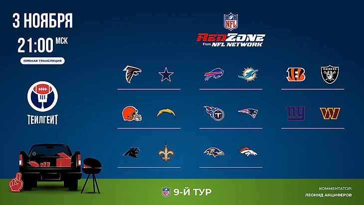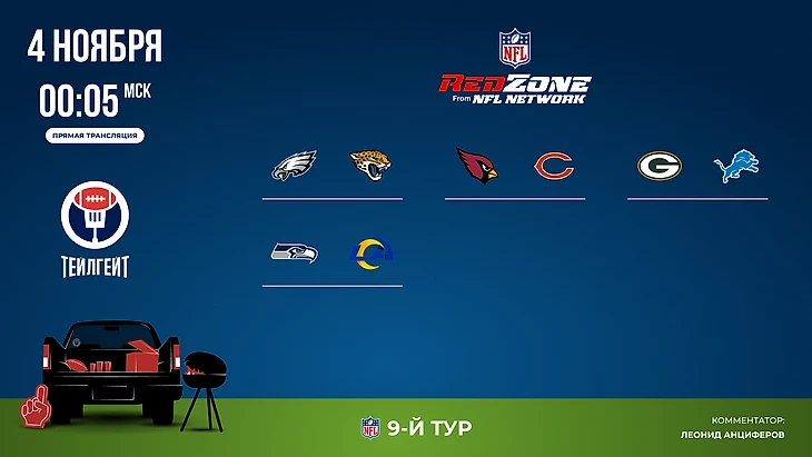 Я вместе с «Питтсбургом» и «Сан-Франциско» отправляюсь на неделю отдыха и пропущу воскресенье, поэтому две волны Red Zone на «Тейлгейте» отработает Леонид Анциферов — 7 часов американского футбола без рекламы!