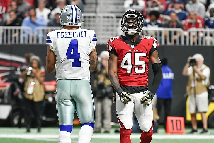 Каким же эффектным получился перехват Джесси Бейтса в игре с «Тампой» на прошлой неделе! Это начало хорошей серии для сейфти «Атланты», потому что предстоит игра против «Далласа». Дак Прескотт уже бросил 8 перехватов и зациклен на бросках в сторону Сиди Лэмба. «Сиди, сам открою», — скажет Бейтс и заберёт мяч.
