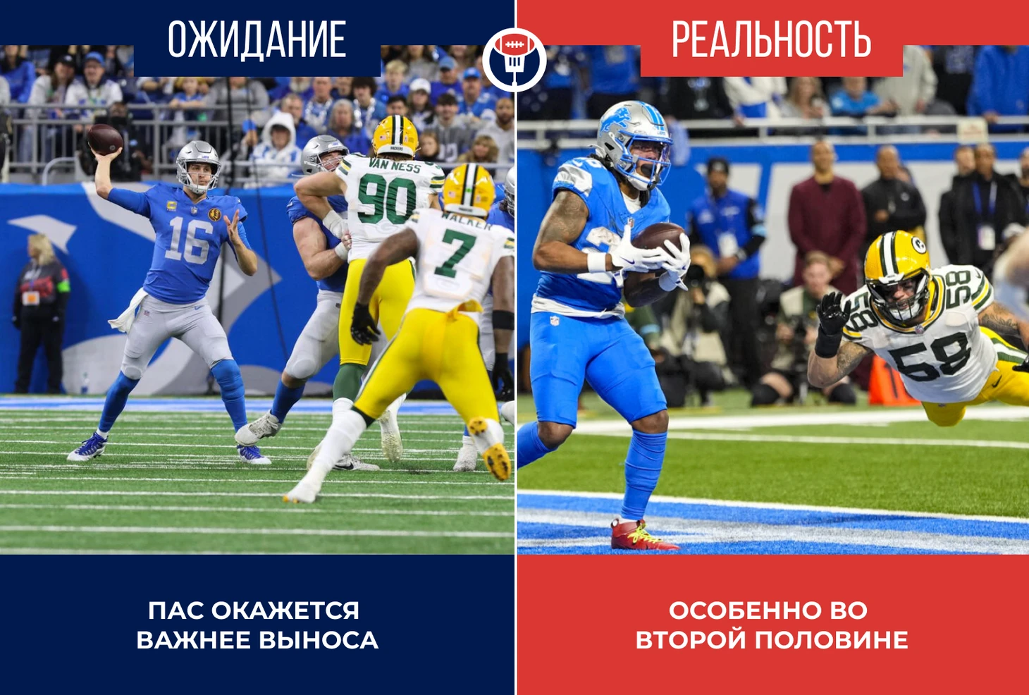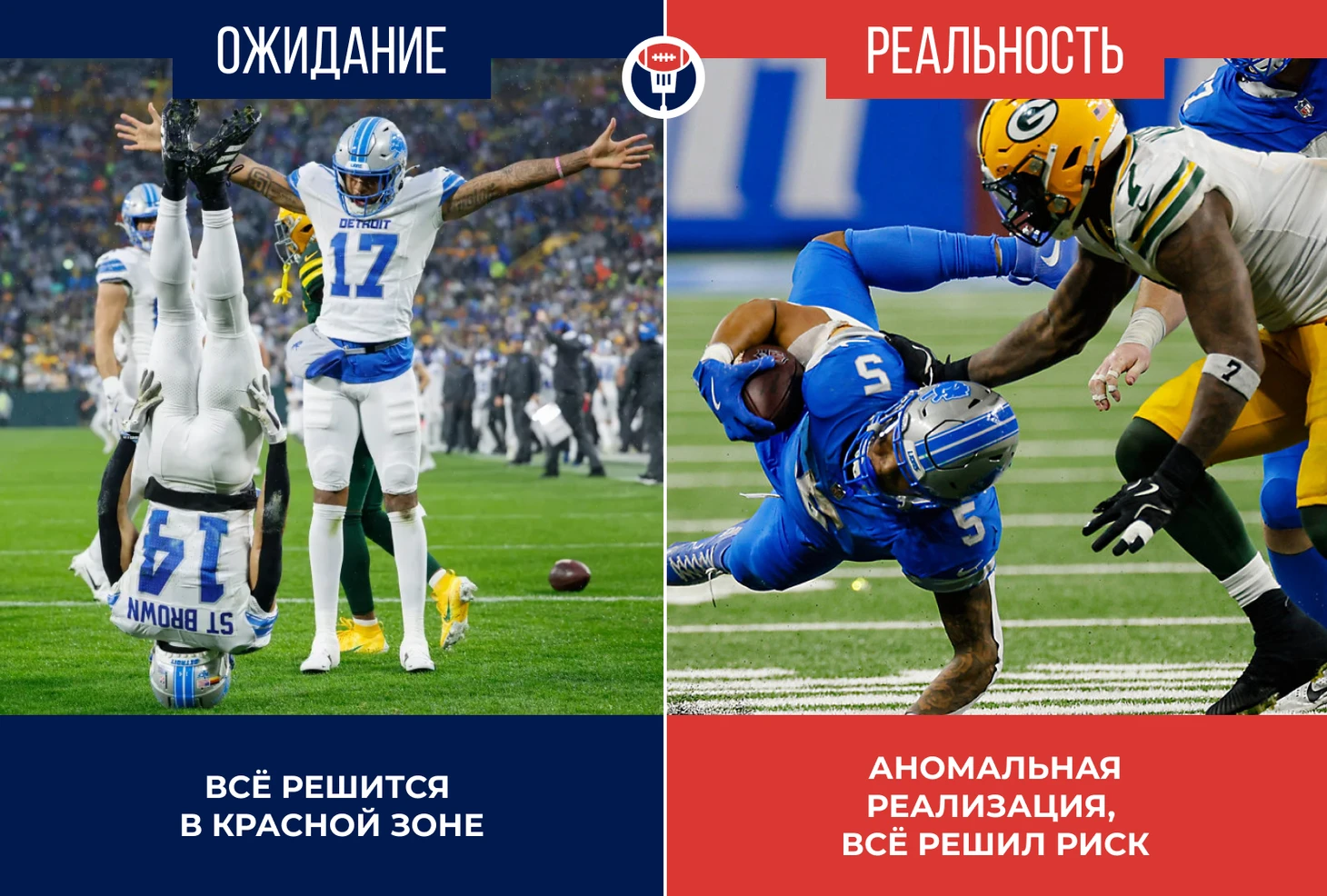 В ситуации, когда «Детройт» вёл игру, две ошибки позволили «Пэкерс» подобраться вплотную по счёту. В начале 3-й четверти Гофф форсировал передачу на Тима Патрика и бросил перехват, дав сопернику начать драйв за 16 ярдов до своей зачётки. В конце 3-й четверти Дэн Кэмпбелл рискнул сыграть 4-и-1 со своей 31-ярдовой линии — Гиббса остановили. Это 14 очков, которые поредевшая защита «Лайонс» просто не могла помешать набрать. И эти ошибки идут вразрез с выбранной стратегией Кэмпбелла на матч — морозить Лава на скамейке, не давать ему набрать игровой ритм и оставаться в перестрелке.