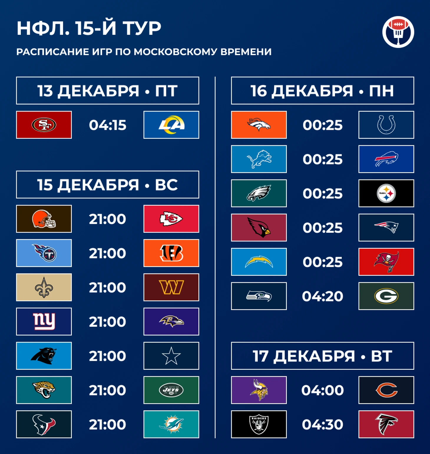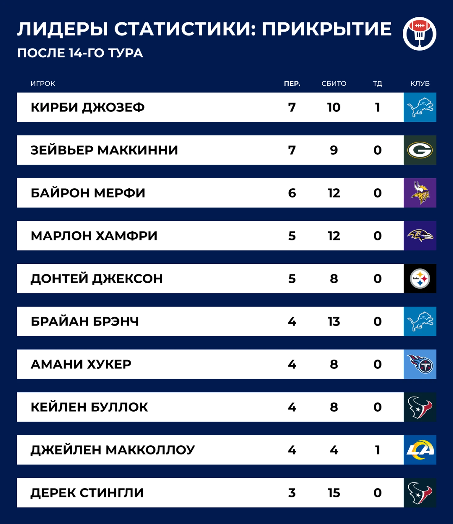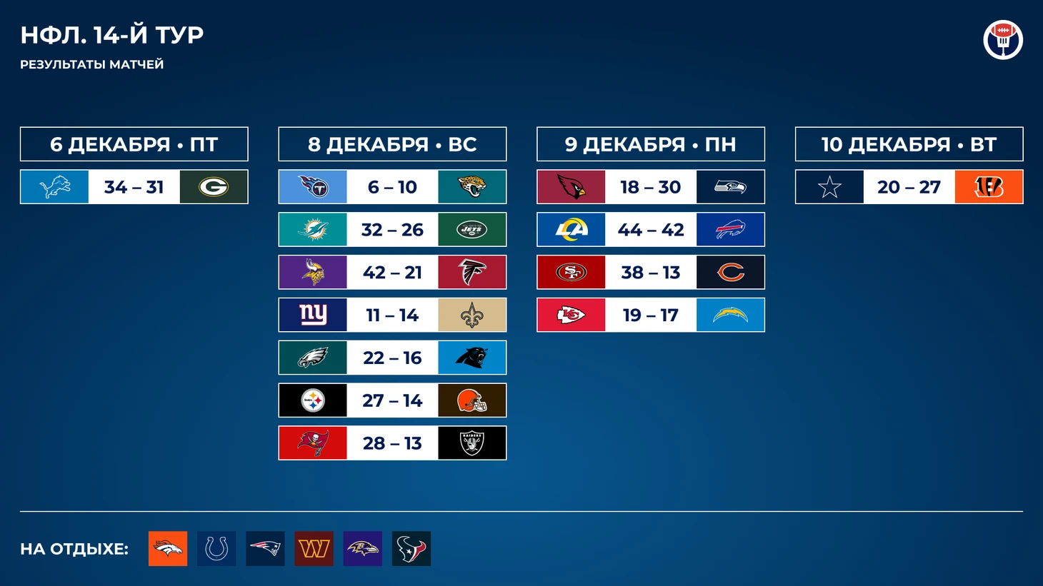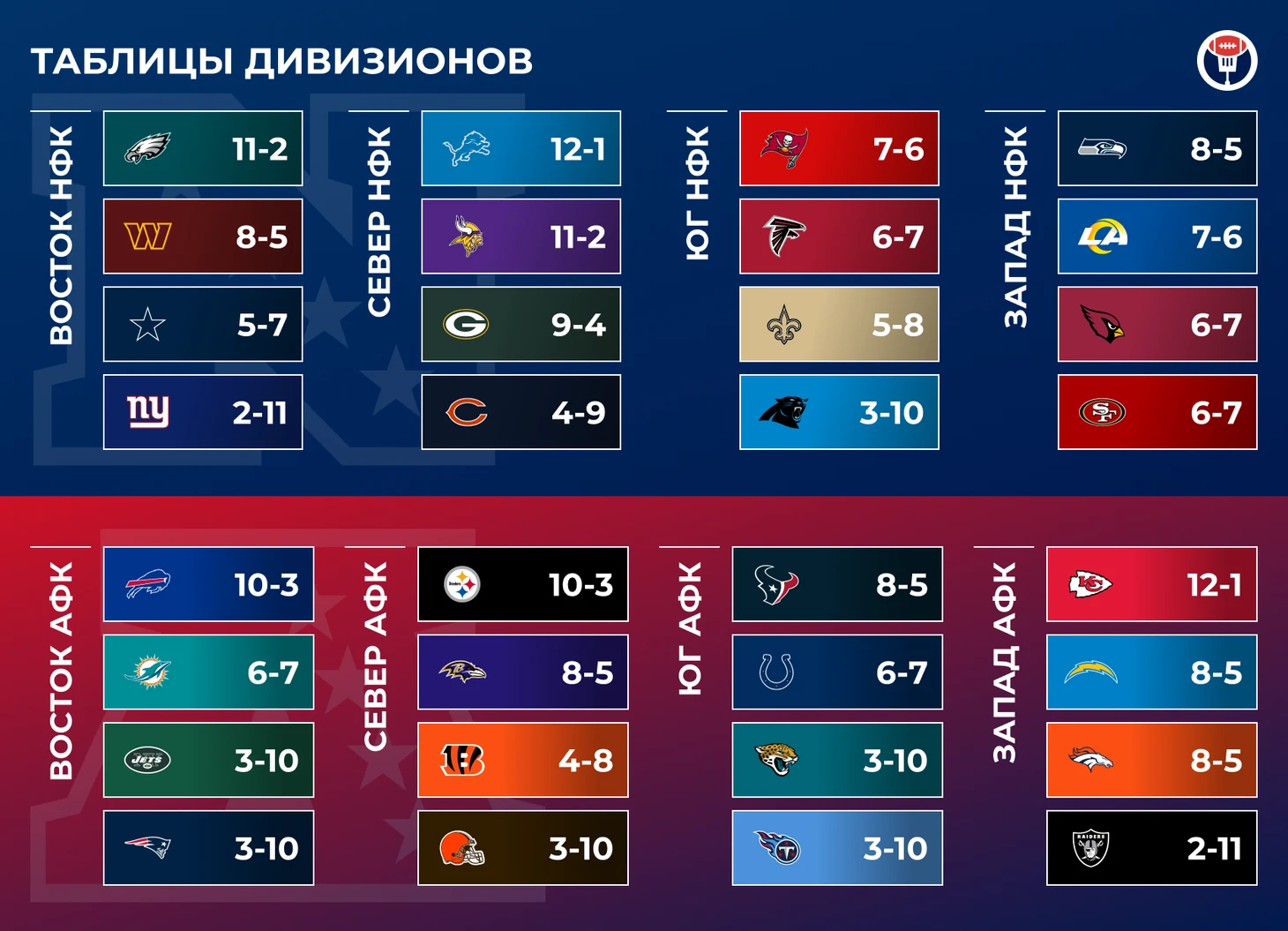 И, напротив, «Рэмс» вывели нападение на пик к самому важному отрезку сезона. Вот таким оно должно было быть с самого начала, но постоянно мешали травмы — Накуа и Купер Капп пропускали игры одновременно и отдельно друг от друга, не до конца был здоров и сам Стэффорд. Но теперь это всё выглядит бомбически. Аналитическая модель ESPN даёт больше всего шансов на победу в дивизионе «Сиэтлу», но после такой игры я не вижу, почему «Рэмс» не могут выиграть все оставшиеся матчи и стать очень неприятным соперником для пятого/шестого посевов в НФК.