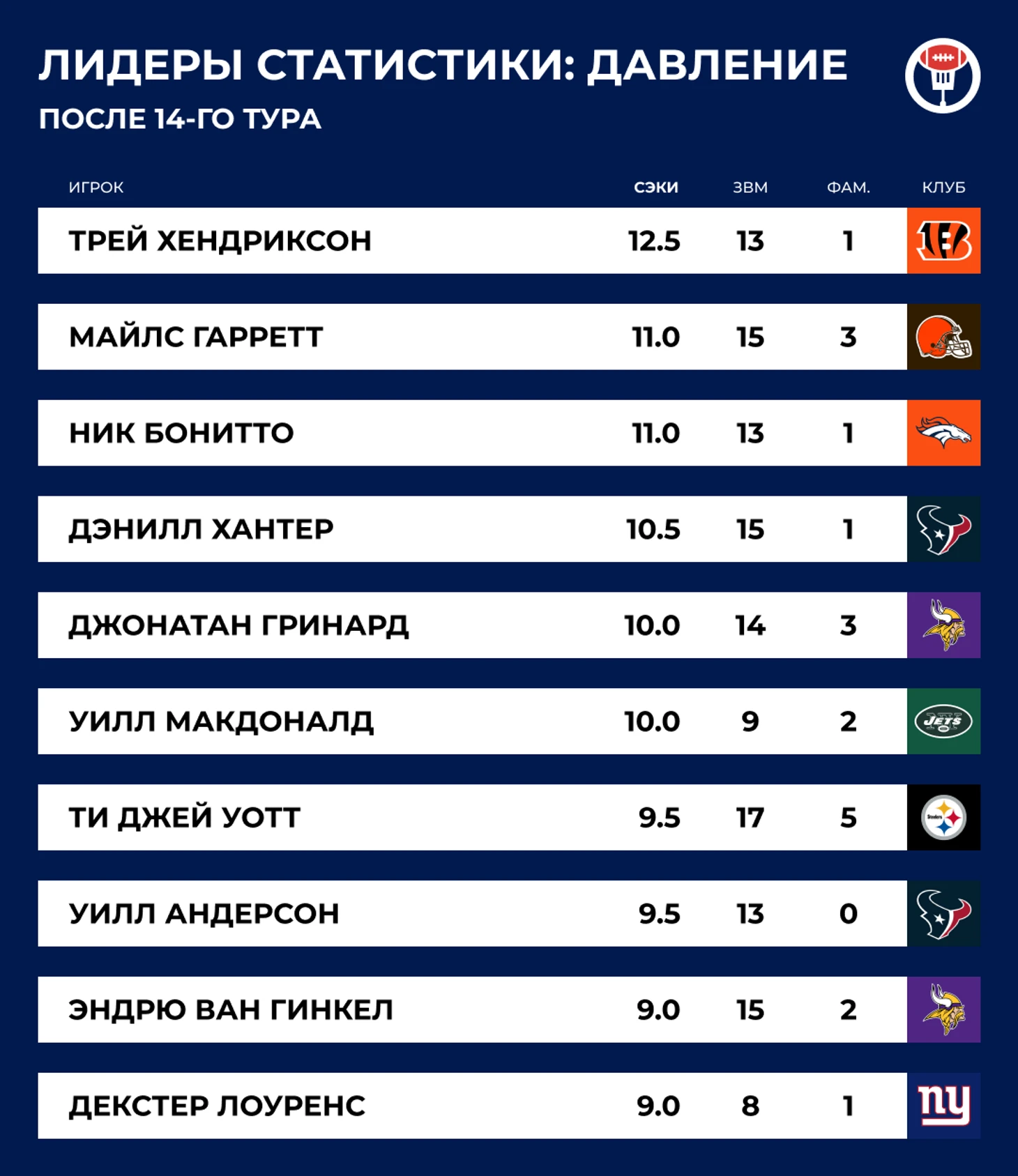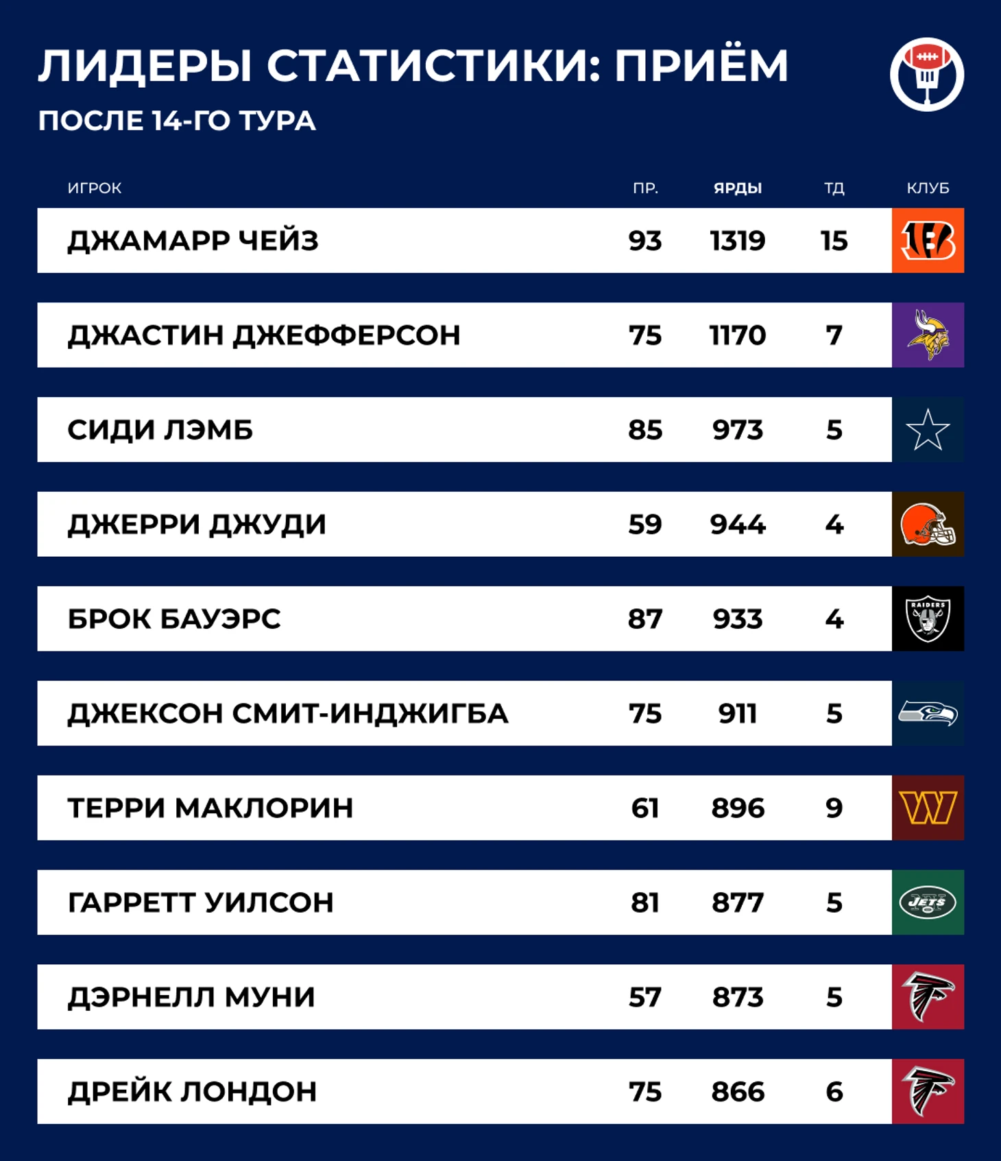 Джамарр Чейз провёл очередной отличный вечер, поймав 14 передач на 177 ярдов с двумя тачдаунами. Прямо сейчас ресивер «Бенгалс» претендует на тройную корону — он лидирует в НФЛ по приёмам (93), ярдам (1319) и тачдаунам (15) на приёме. В последний раз обладателем тройной короны становился Купер Капп в сезоне 2021 года.