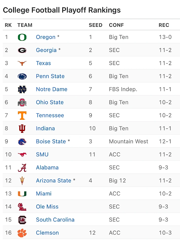 После финальных игр в конференциях сформировался топ-12, который и сразится за титул национального чемпиона. Первыми идут чемпионы конференций, имеющие наиболее высокие места в рейтинге комитета: Орегон Джорджия Бойз Стейт Аризона Стейт