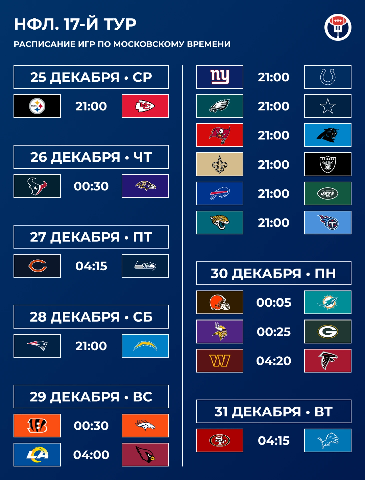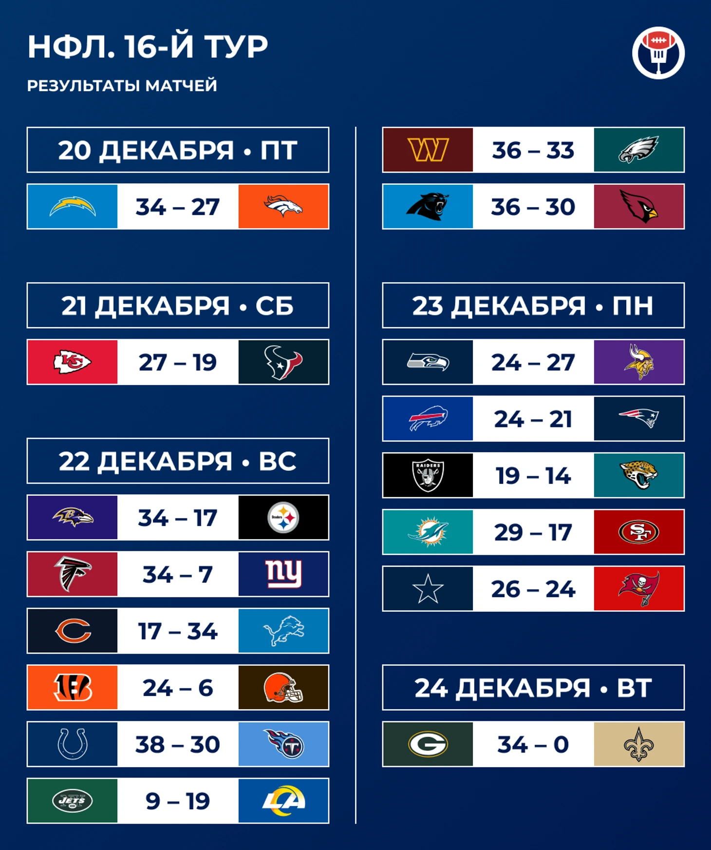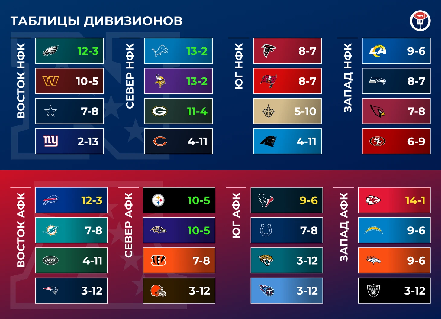 Сейчас две последних путёвки в руках у «ЛА Чарджерс» (9–6) и «Денвера» (9–6). Первым для достижения цели нужно выиграть один из двух оставшихся матчей, а в соперниках «Пэтриотс» (3–12) и «Рейдерс» (3–12). Кажется, за «Чарджерс» можно не переживать.