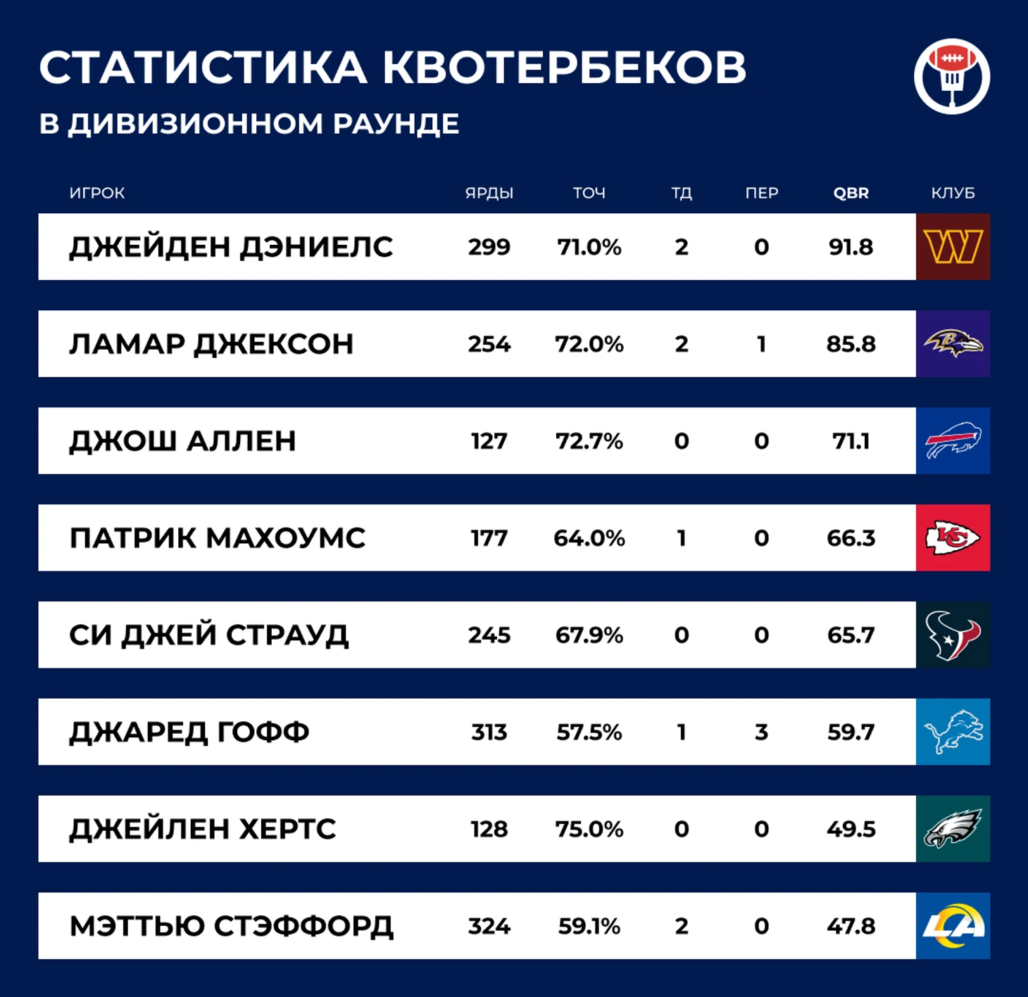 Джейден Дэниелс стал 6-м квотербеком в эпоху Супербоула, которому удалось дойти до финала конференции в дебютный сезон. До него это были Шон Кинг (1999), Бен Ротлисбергер (2004), Джо Флакко (2008), Марк Санчез (2009) и Брок Парди (2022).