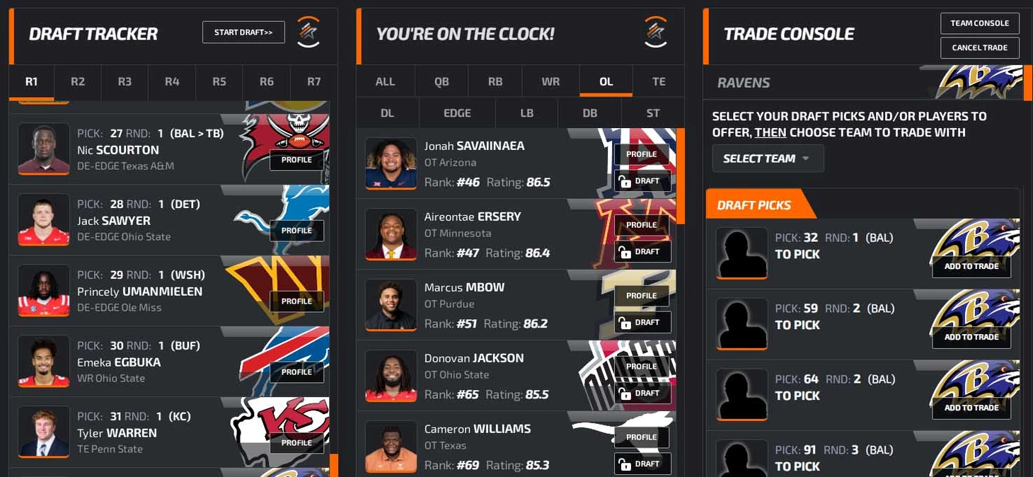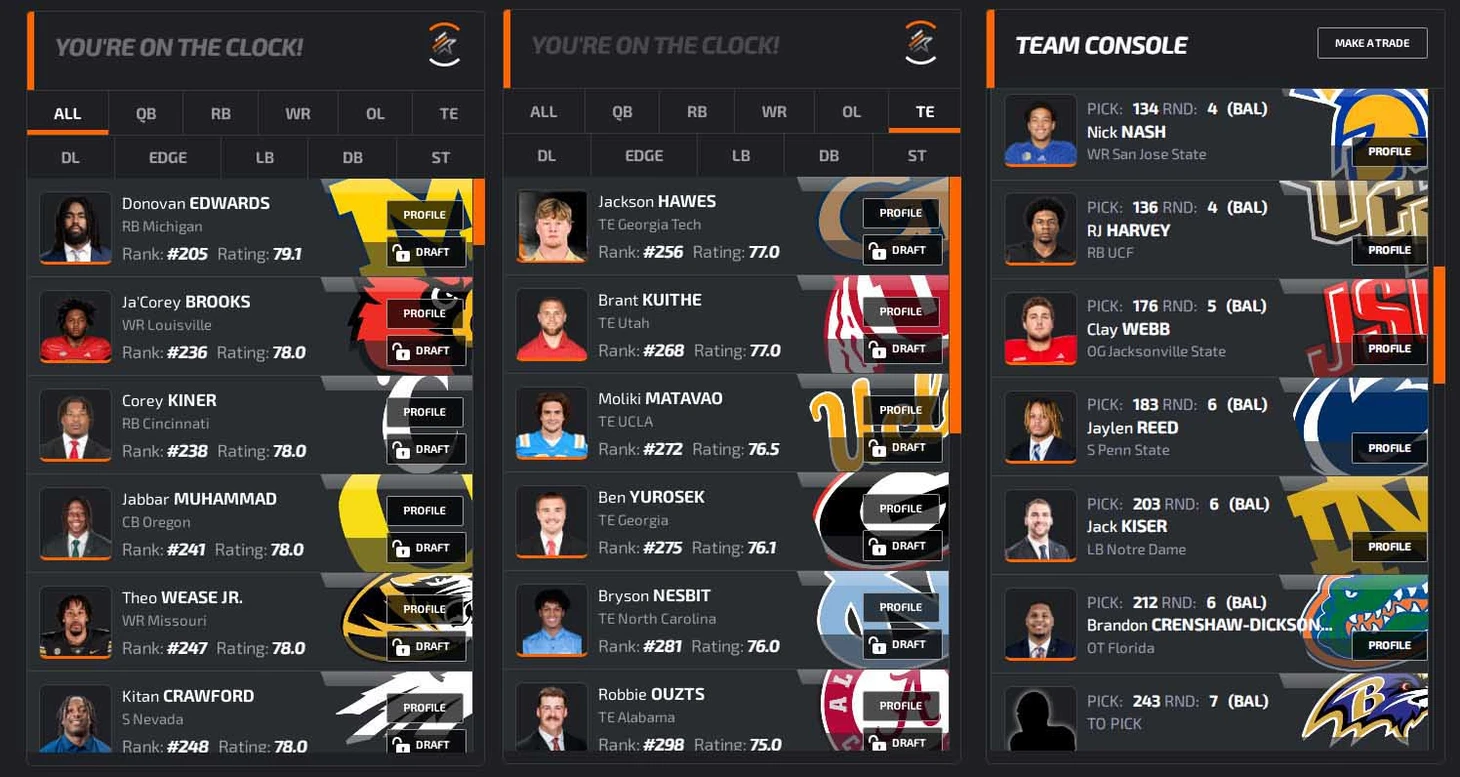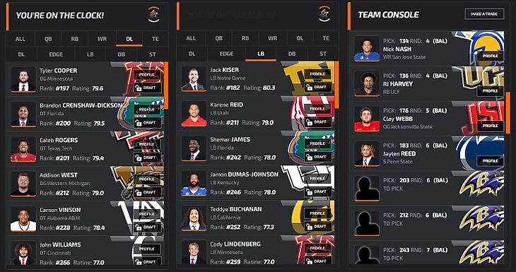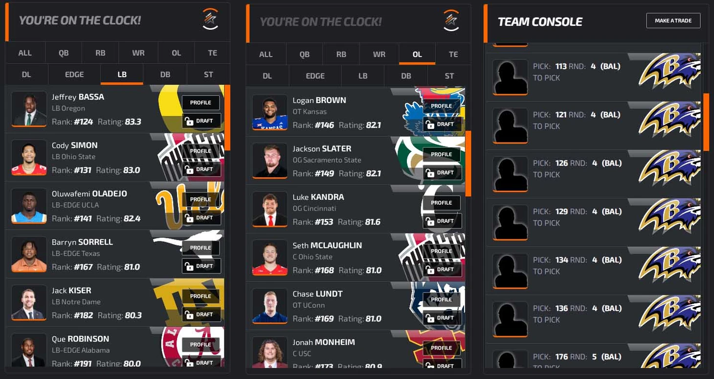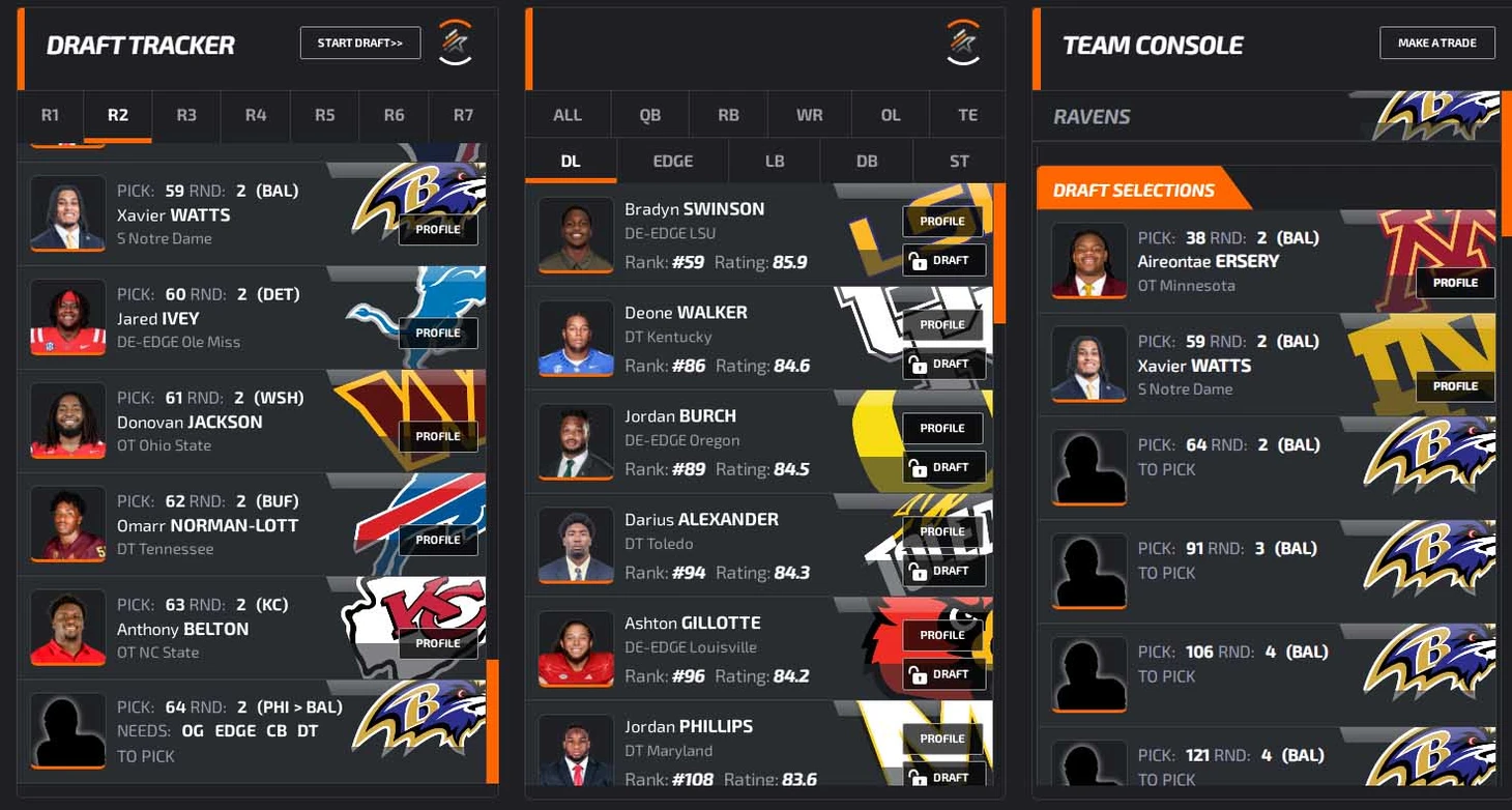 В заключение преддрафтового цикла откатаем драфт на симуляторе. В качестве площадки возьмем NFLdraftBUZZ. Он красивенький, и борд там жесткий: все наши главные ниды (особенно EDGE) стоят по номерам высоко, выбрать хороших игроков будет сложно. Заодно приведу грейды PFF (если 70+, то неплохо, а если 80+, то даже хорошо).