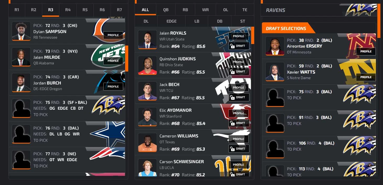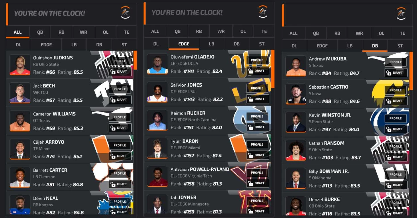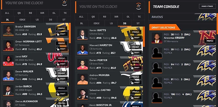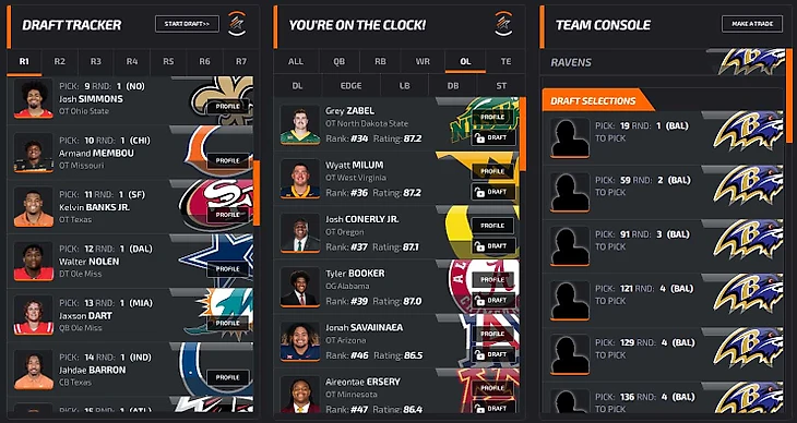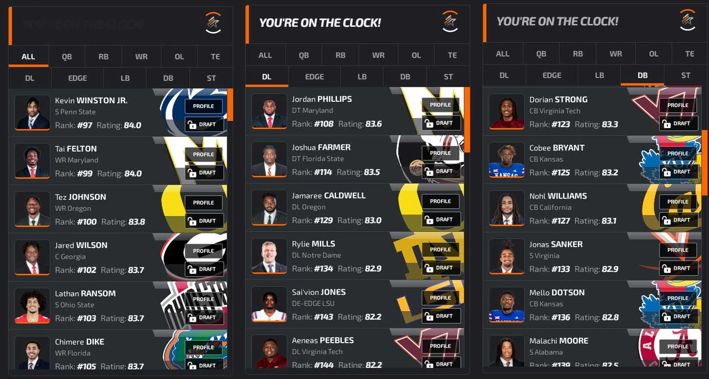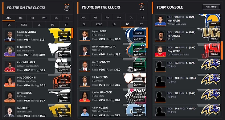 В заключение преддрафтового цикла откатаем драфт на симуляторе. В качестве площадки возьмем NFLdraftBUZZ. Он красивенький, и борд там жесткий: все наши главные ниды (особенно EDGE) стоят по номерам высоко, выбрать хороших игроков будет сложно. Заодно приведу грейды PFF (если 70+, то неплохо, а если 80+, то даже хорошо).