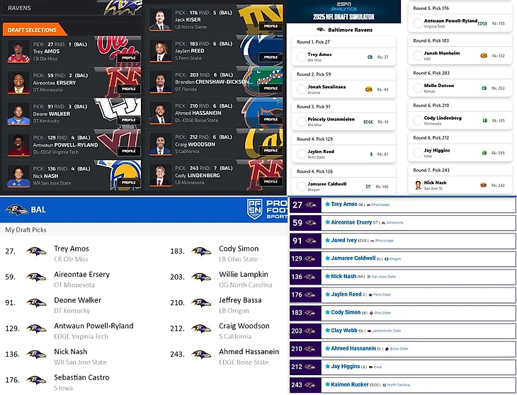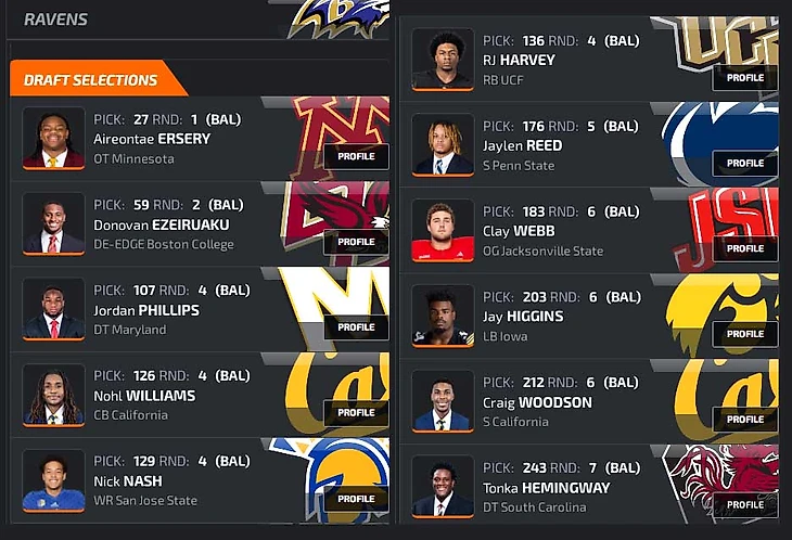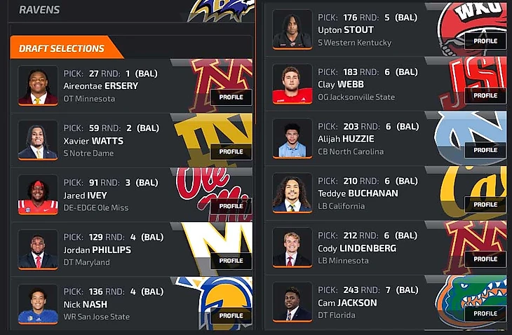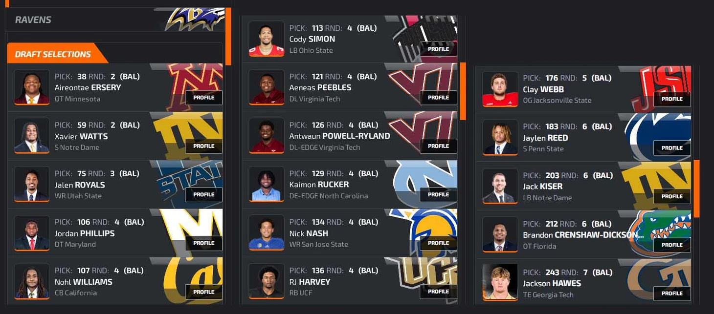 Наверное, я наменял нереально много пиков. Однако: 1) без пары обменов я выбирал бы выше, взял бы эджа получше (Свинсона вместо Роялса и Ракера), а без Пиблза и Ракера вполне проживу. Хотя и от них не отказался бы: помните, отсутствие глубокой ротации в D-line ведет к утомленности защиты в последней четверти, 2) в 4-м раунде я драфтовал с запасом по номерам на борде, и все равно выбрал бы тех, кого наметил, 3) ради этой кучи игроков я по факту расстался с Эндрюсом, качественным состоявшимся ТЕ. Отдавал-то я его ради подъема за Симмонсом, но пролетел. И пришлось разменивать на мешок картохи разной степени готовности, 4) всегда найдется команда, решившая подняться за QB. Например, Гиганты или Рэйдерс за Джексоном Дартом в конец 1-го или за Милро во 2-й раунд, и 5) так веселее и борды лучше изучаются.