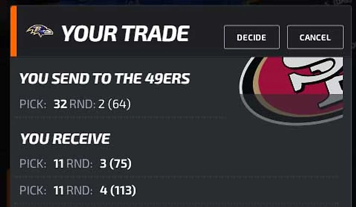 Обмен с Сан-Фран: 64-й пик на 75-й и 113-й. Не прошел бы 113-й, взял бы следующий, у 49-х пиков много.