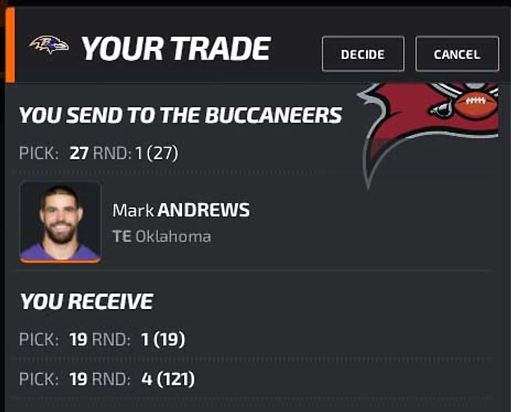 Эндрюс + 27 пик на 19 + 121 (4-й раунд) пики. Не знаю, насколько реален в действительности такой обмен. Не прошел бы обмен с Тампой, прошел бы обмен с Чарджерс без Джонсона.