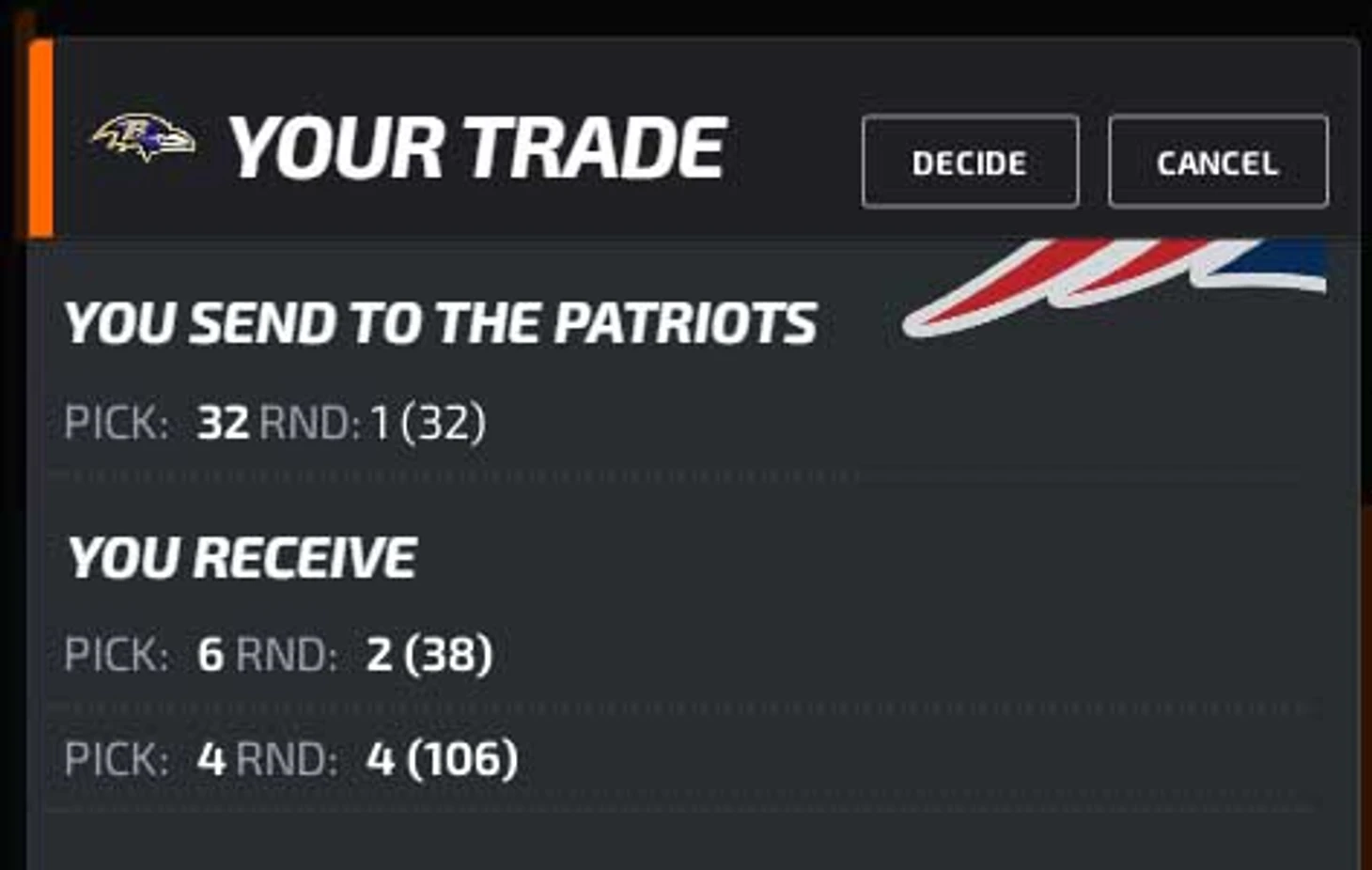 Шаг 4. Обмен с Пэтриотс: 32-й пик на 38-й и 106-й.