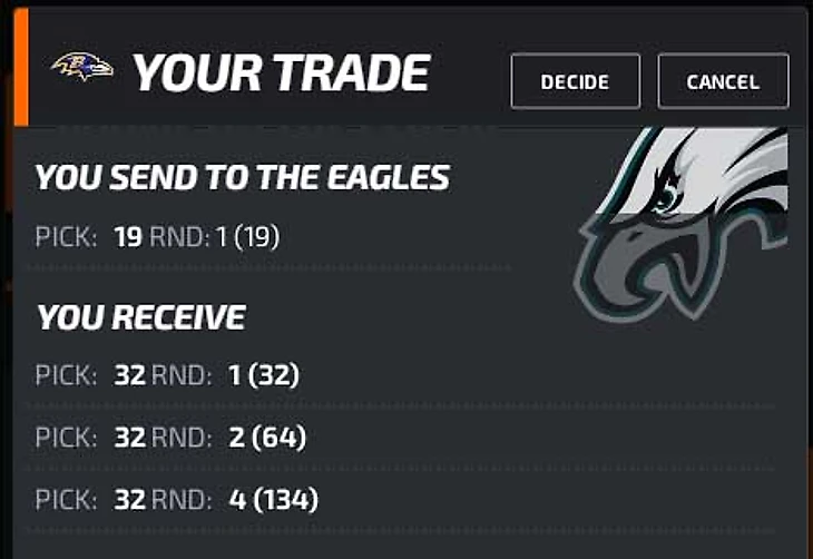 Обмен такой: наш пик №19 на 32-й, 64-й и 134-й, последние пики 1-го, 2-го и 4-го раунда, не считая компенсационных.