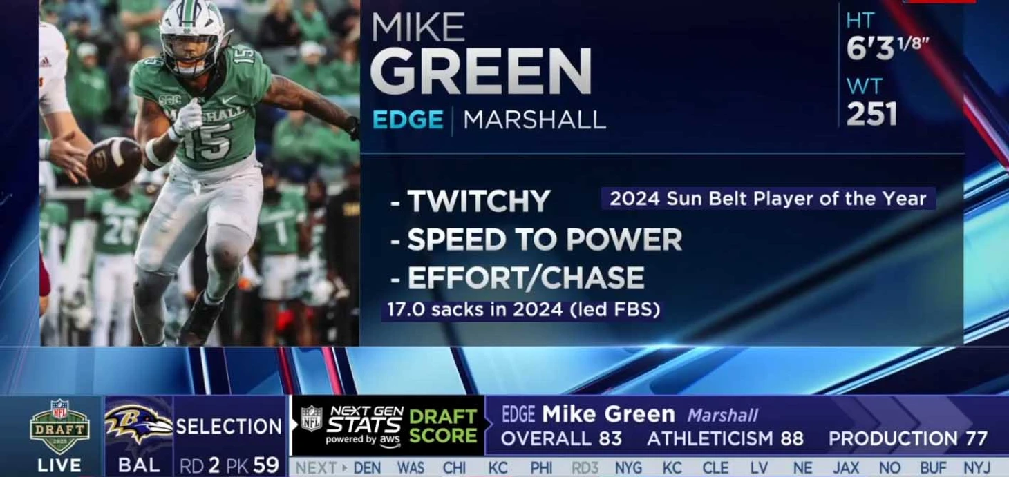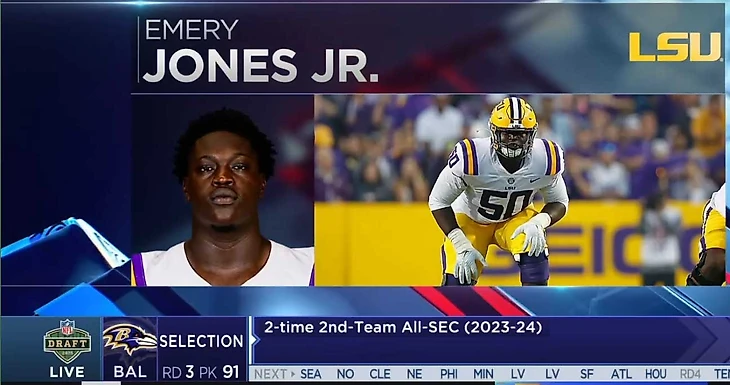 Наш выбор: RT Эмери Джонс. Выхватив как-то козырного туза в виде QB Ламара Джексона, мы в течение долгих лет демонстрировали бессилие в облегчении его участи. Потратив три пика 1-го раунда на WR, мы так и не создали смертельной группы атаки. А игнорируя O-line, довели ее до деградации. На драфте 2024 года мы вдруг выбрали Розенгартена – лучшего ОТ второго уровня по технике и скорости перемещения, чем зародили надежду на осмысленность решений офиса. Решение этого года показало, что это был флюк. Просто повезло попасть. Потому что в этом году мы выбрали противоположного кадра: «тяжелого на ногах» неповоротливого атлета из второй сборной конференции SEC. Да, SEC – самая сильная конференция, да, именно на него нападали все эти выбранные эджи из 1 и 2 раунда. Но это не оправдывает выбор под таким высоким пиком всего лишь бэкапа гарда. Зачем нам Джонс?