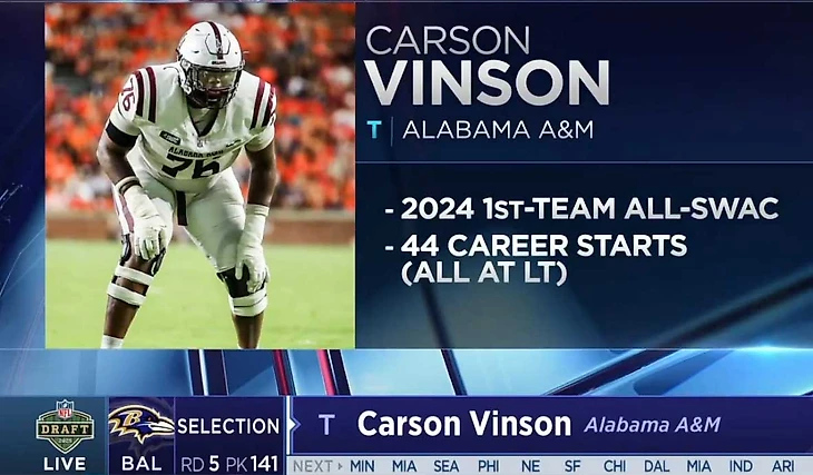 5. Пик № 141. LT Карсон Винсон. Физически одаренный парень, игравший в деревне, и приезжавший к нам на просмотр. Очень сырой, необученный, но могучий и быстрый. Забрезжила надежда, что офис пришел в себя, решив разумно. Взял планируемую замену Ронни Стэнли через два года.