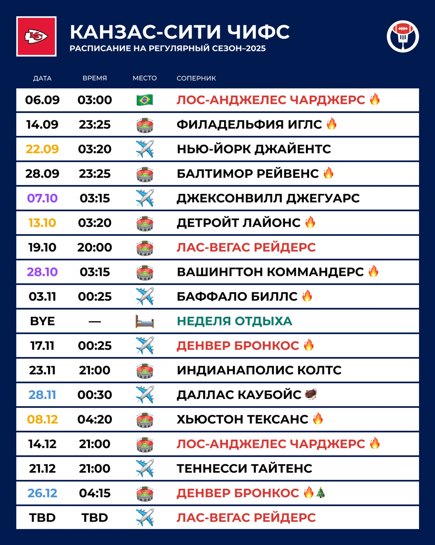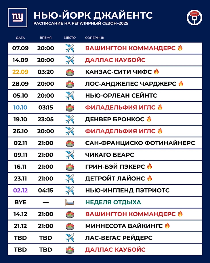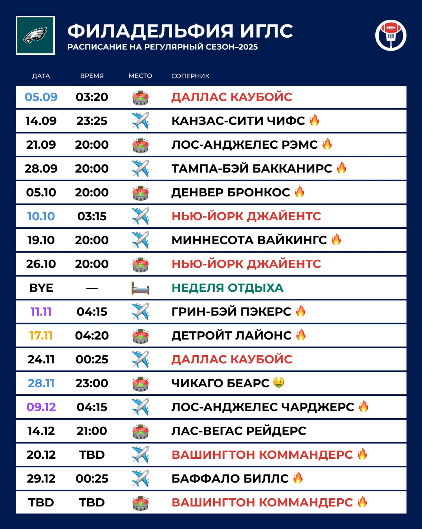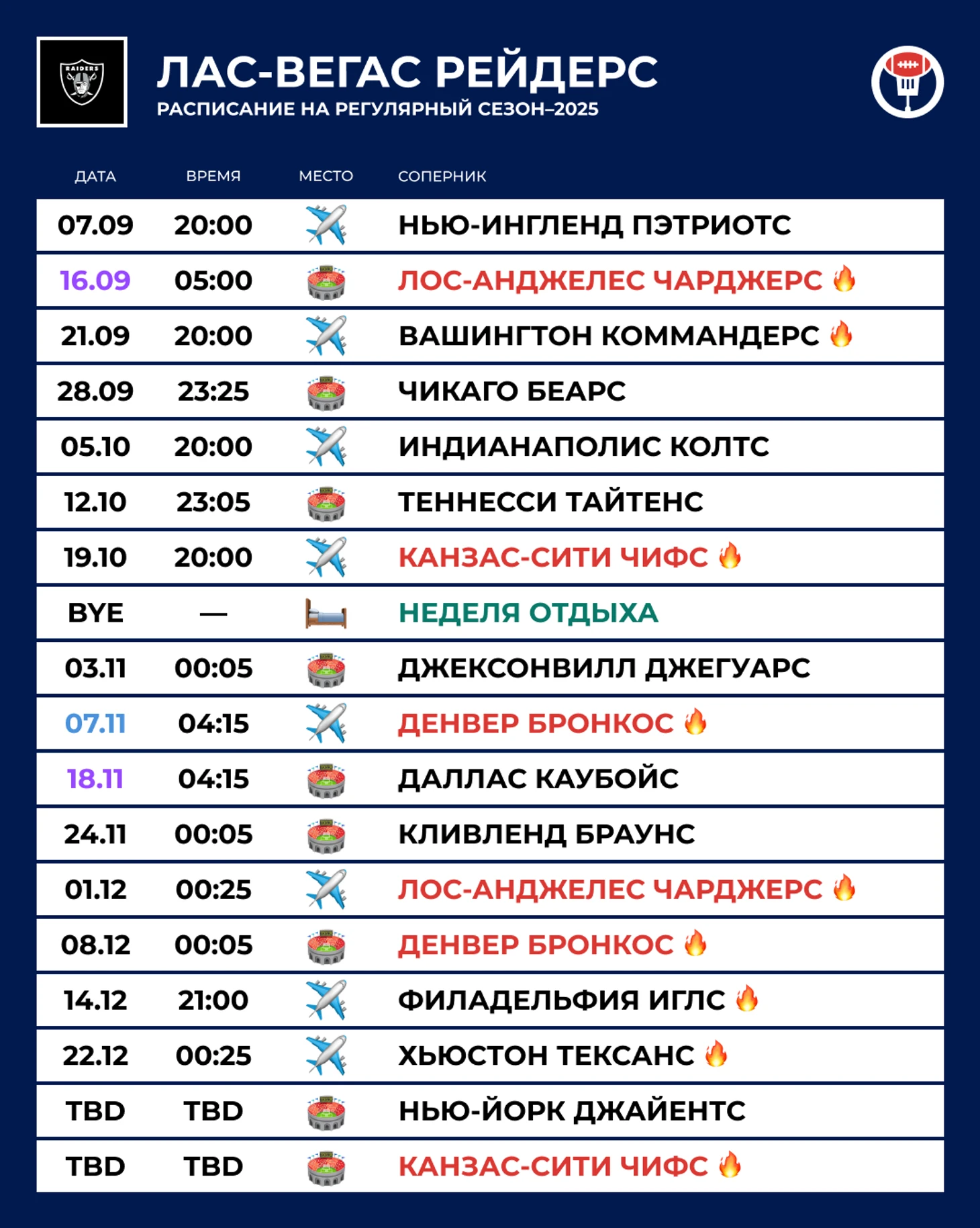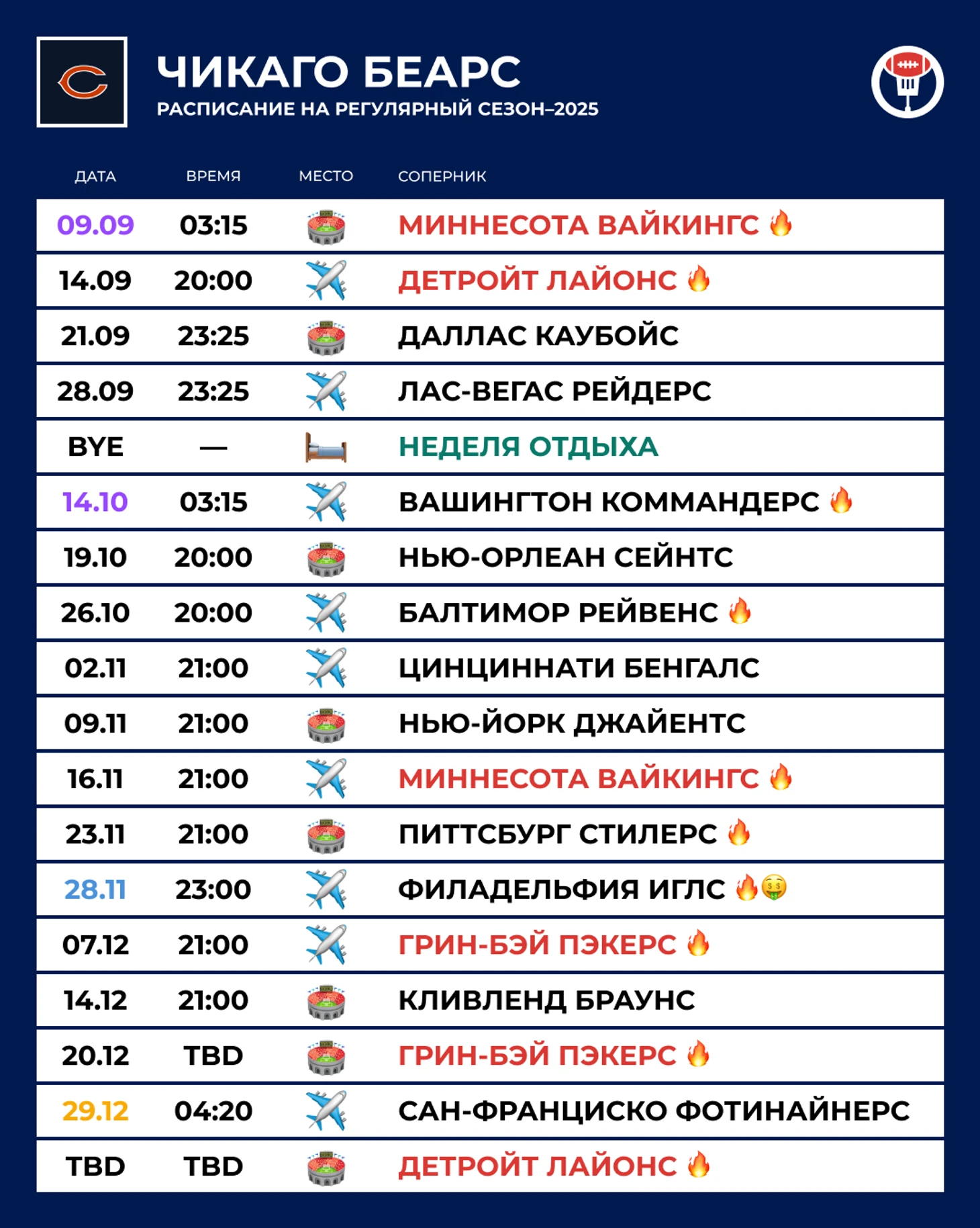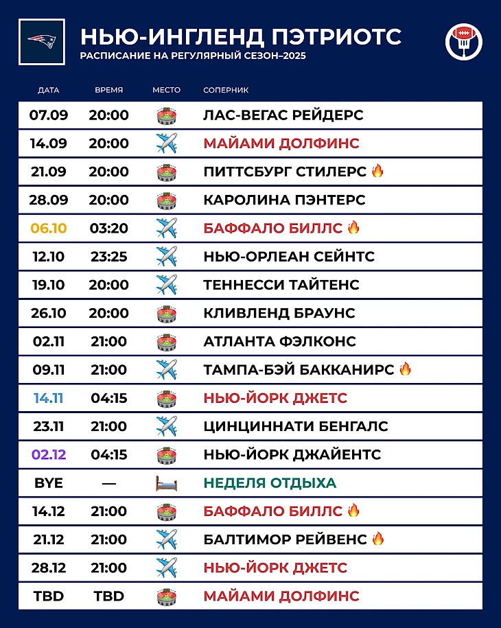 Минувшей ночью НФЛ опубликовала расписание на регулярный сезон–2025. «Тейлгейт» создал карточки для каждой из 32 команд, где время начала матчей указано по московскому времени.