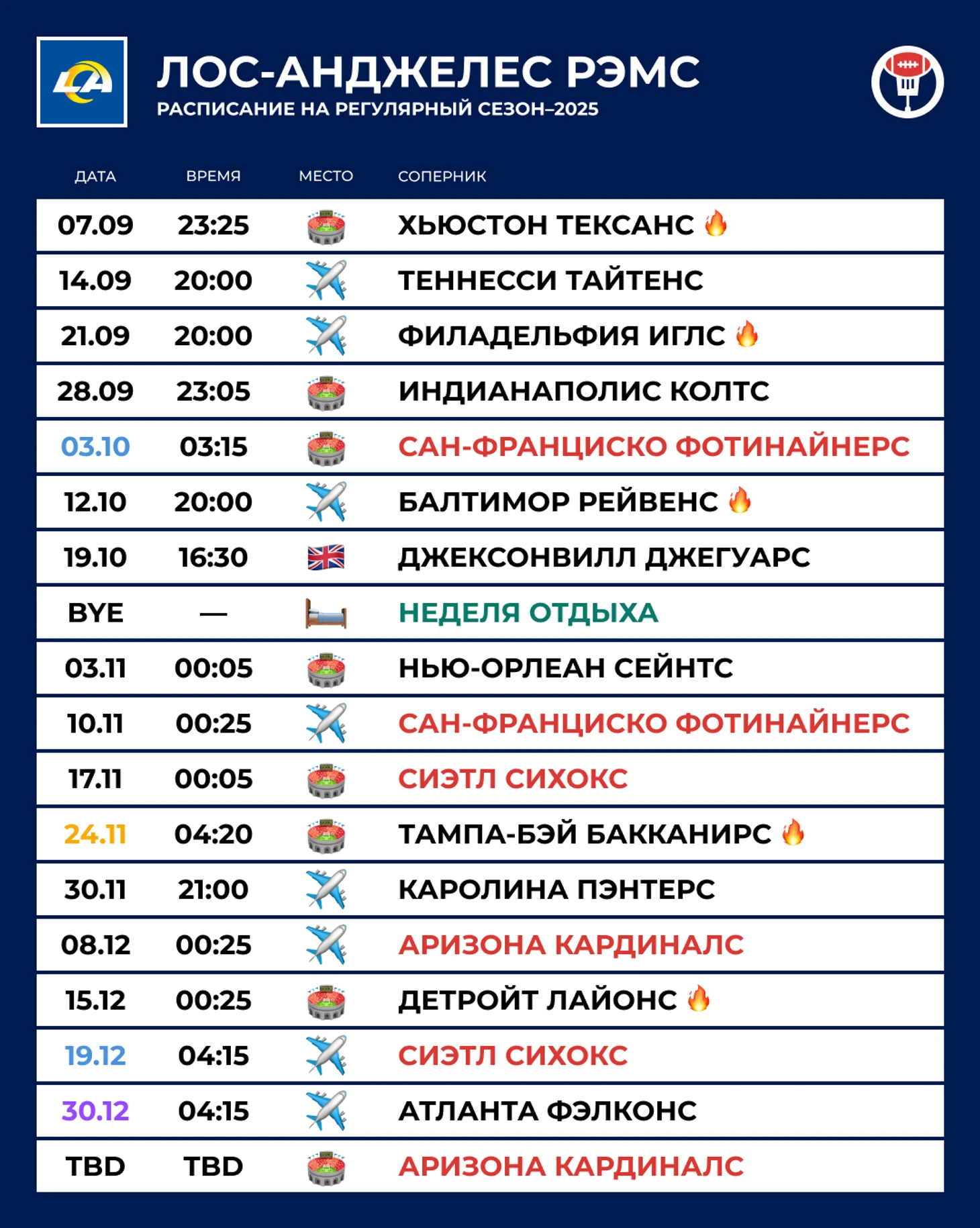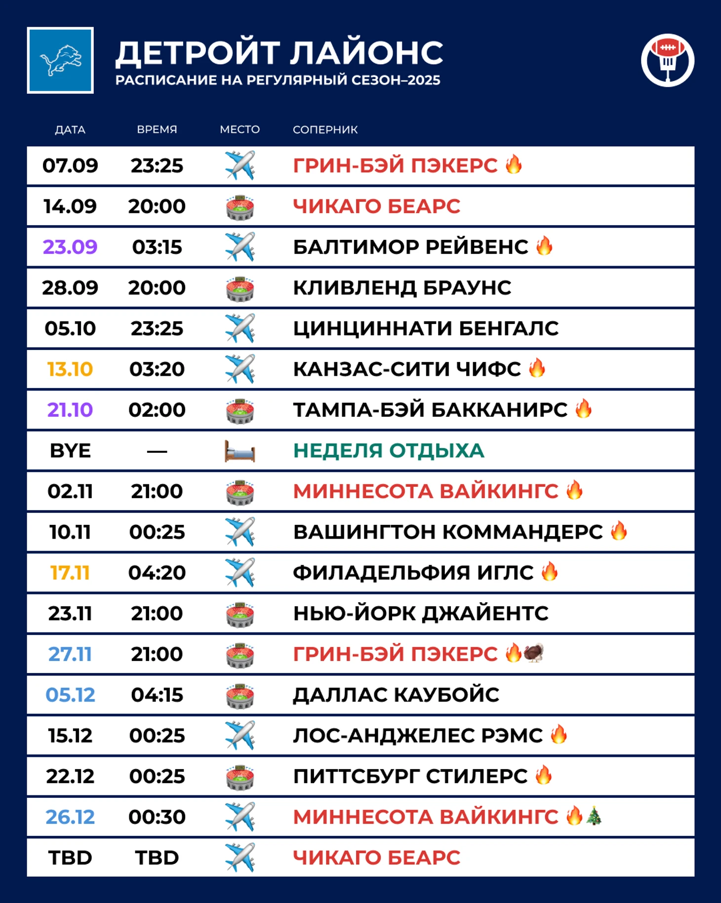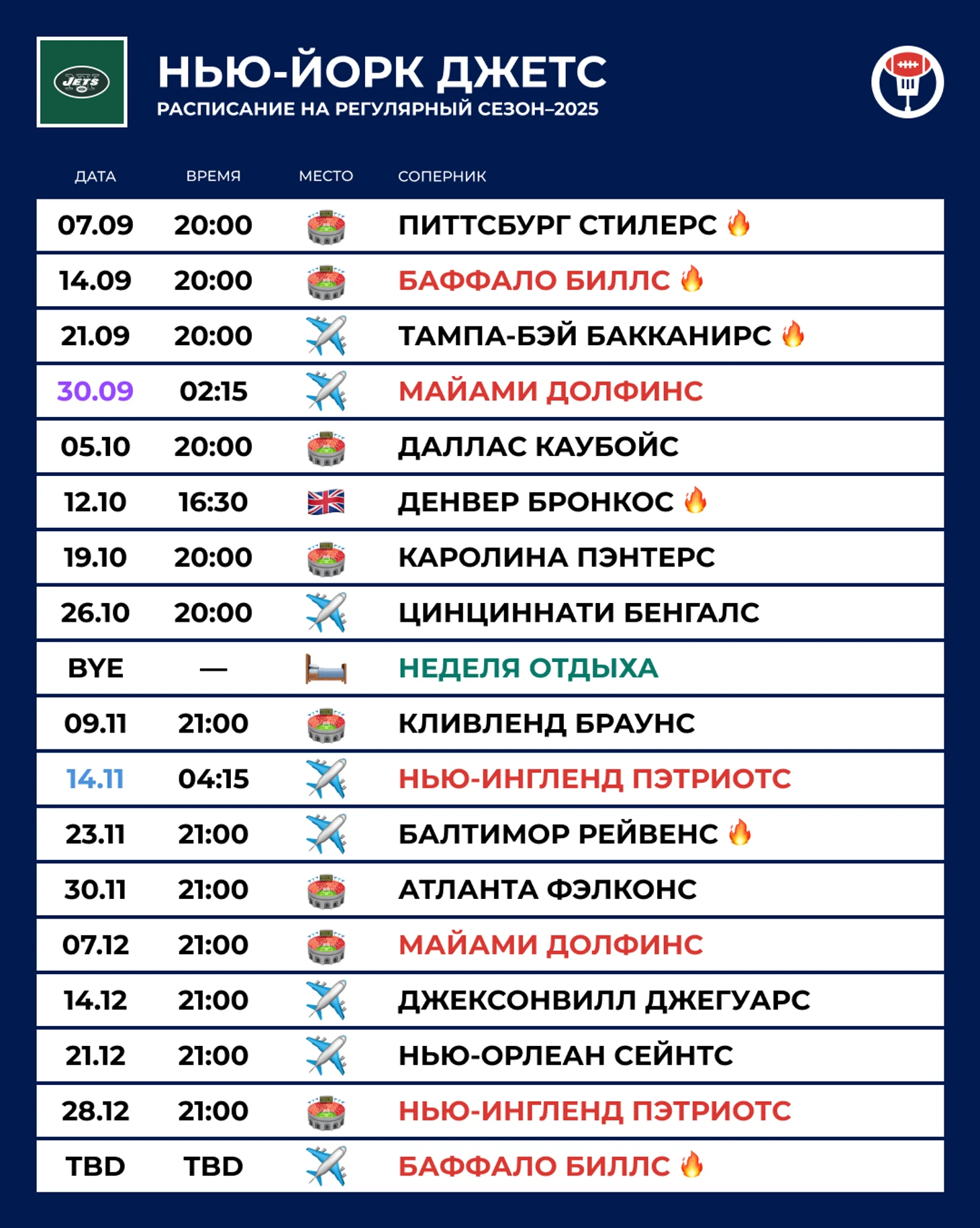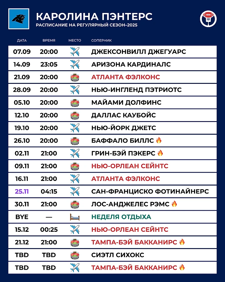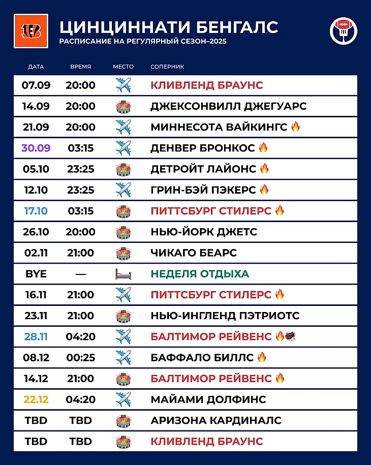 Минувшей ночью НФЛ опубликовала расписание на регулярный сезон–2025. «Тейлгейт» создал карточки для каждой из 32 команд, где время начала матчей указано по московскому времени.