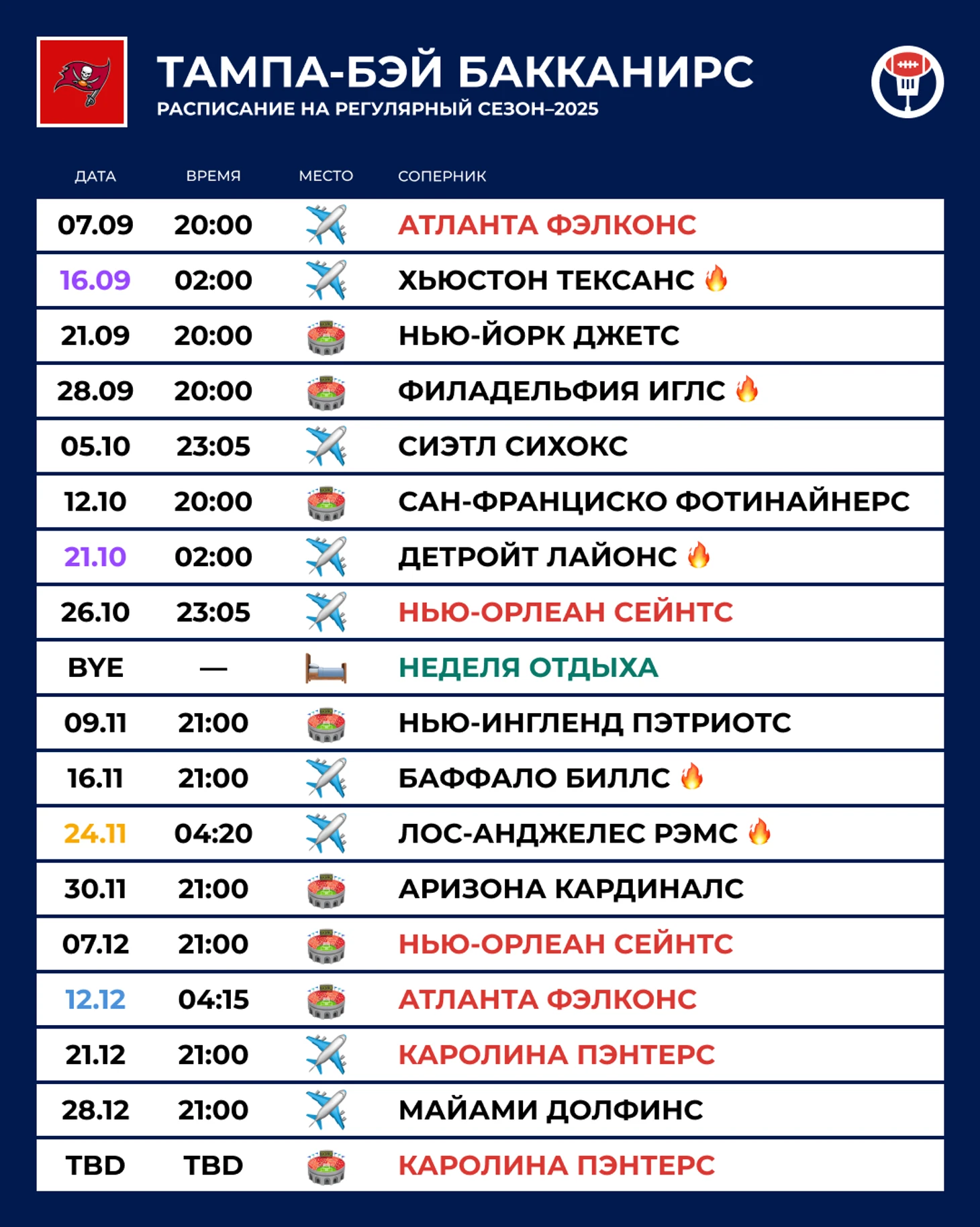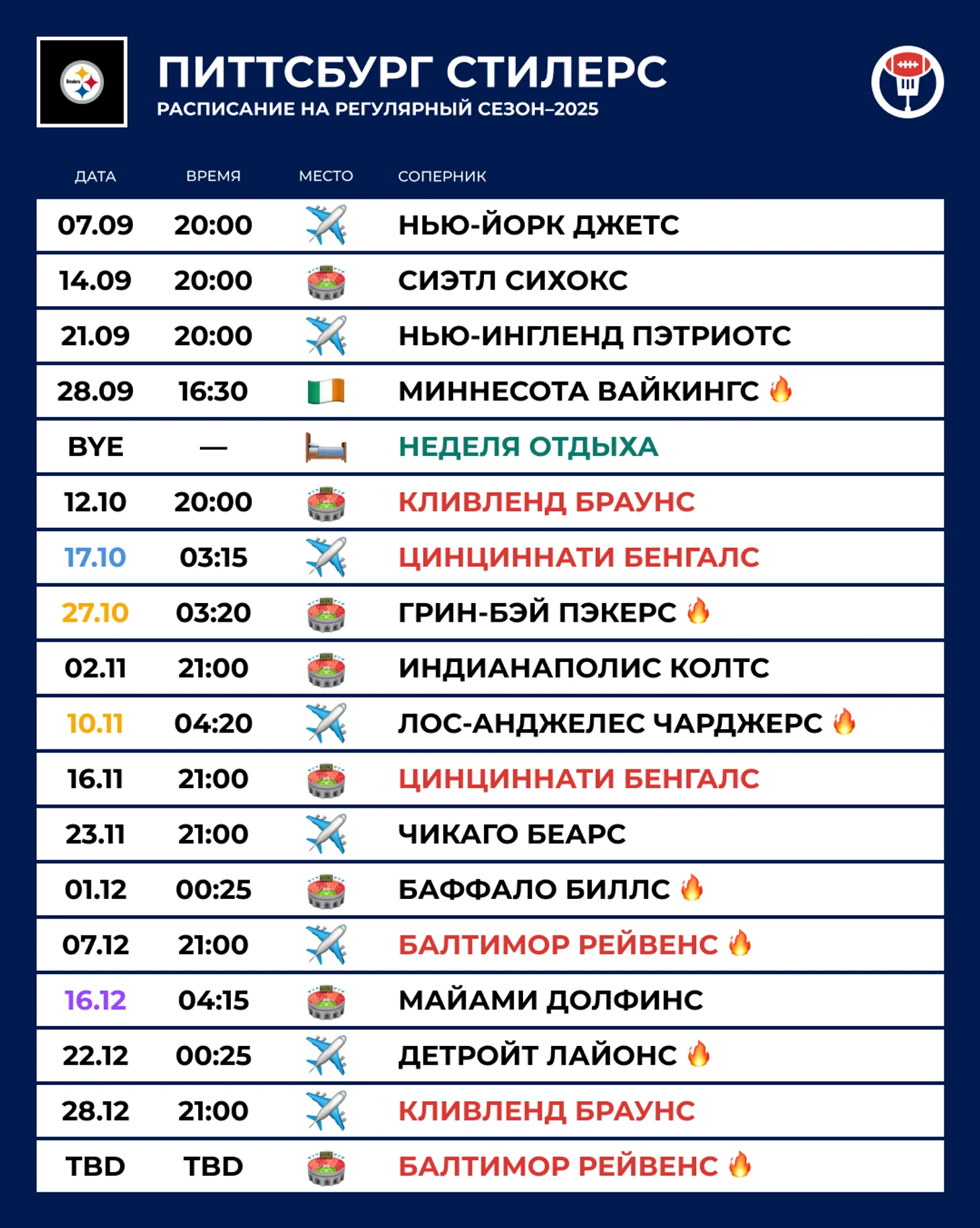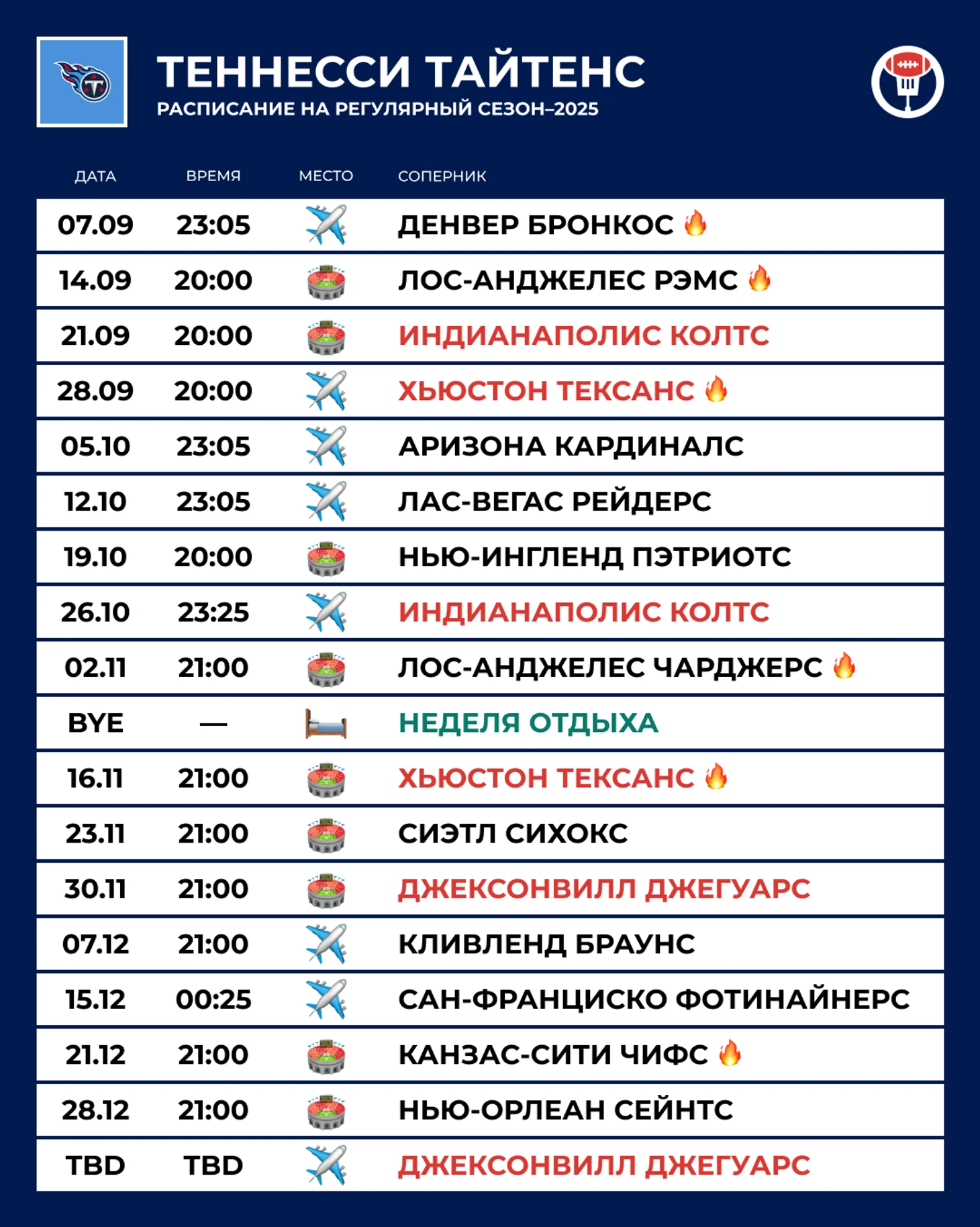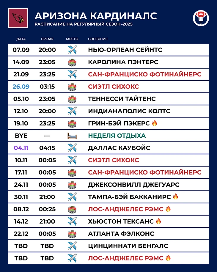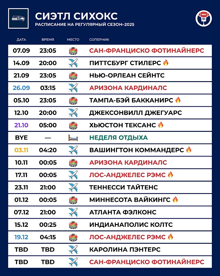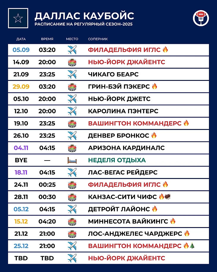 Минувшей ночью НФЛ опубликовала расписание на регулярный сезон–2025. «Тейлгейт» создал карточки для каждой из 32 команд, где время начала матчей указано по московскому времени.