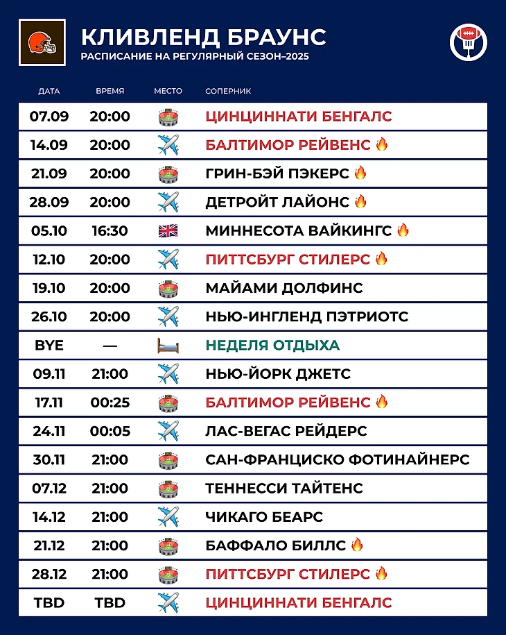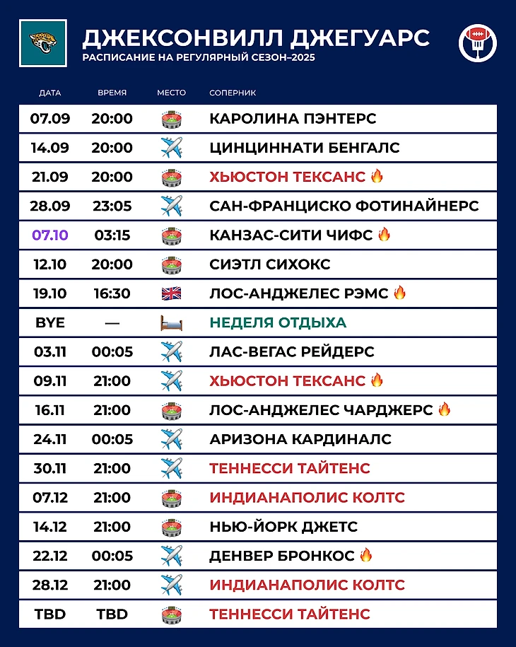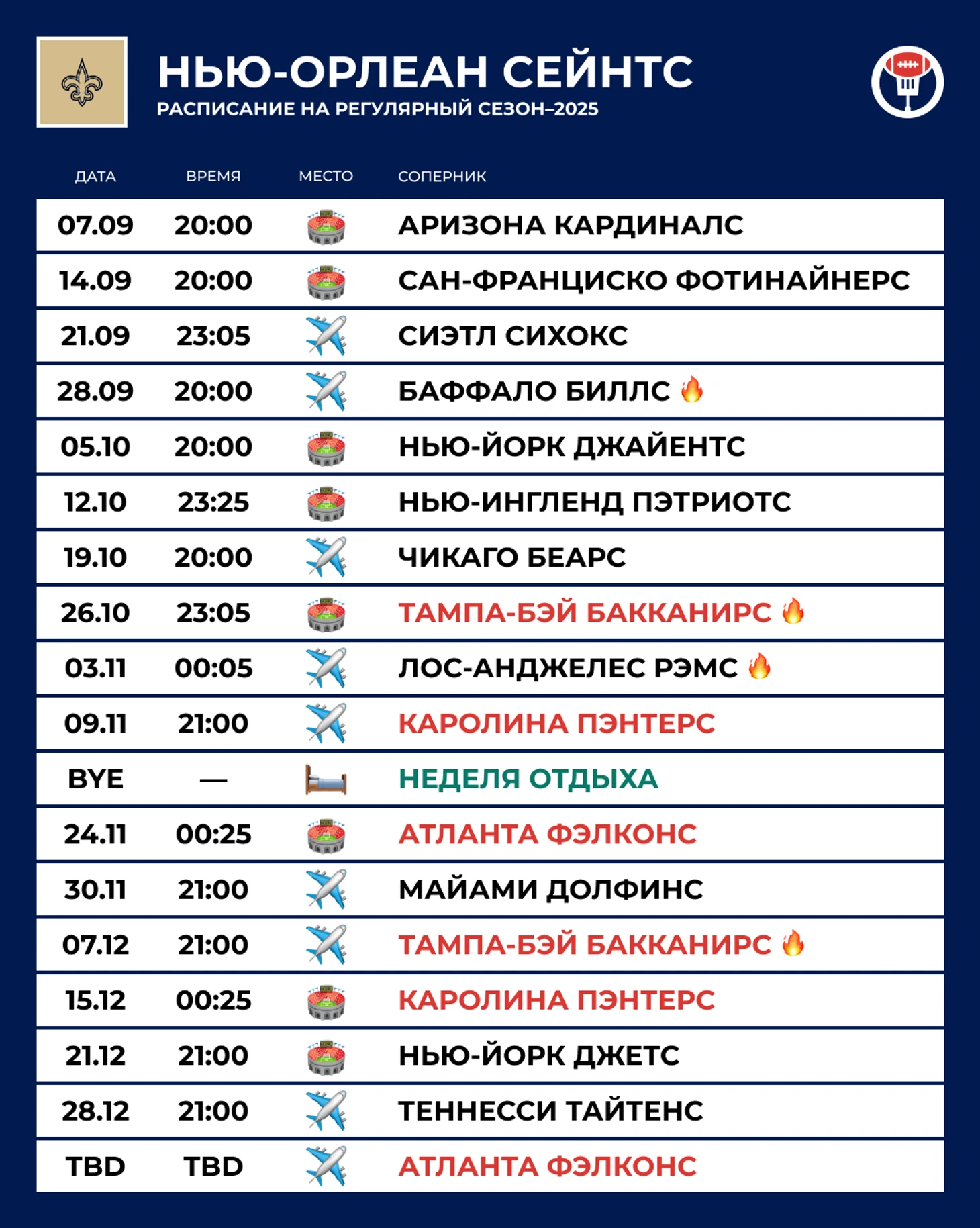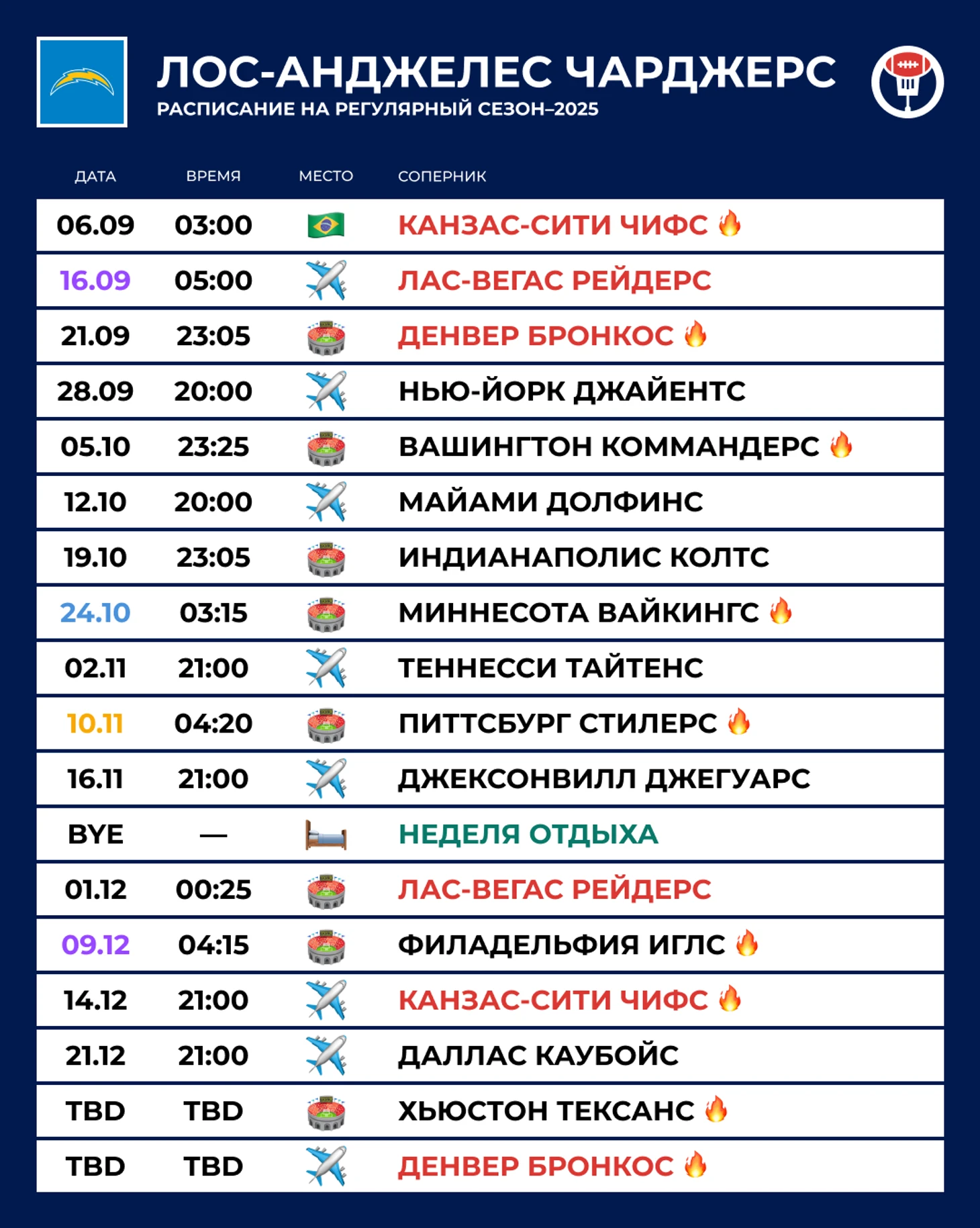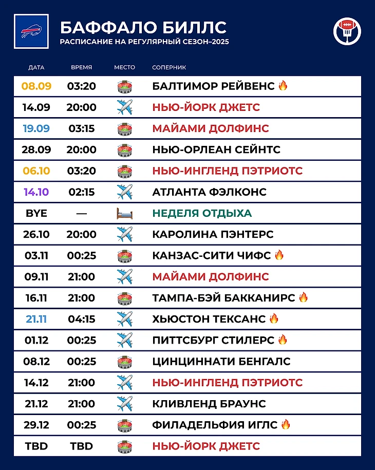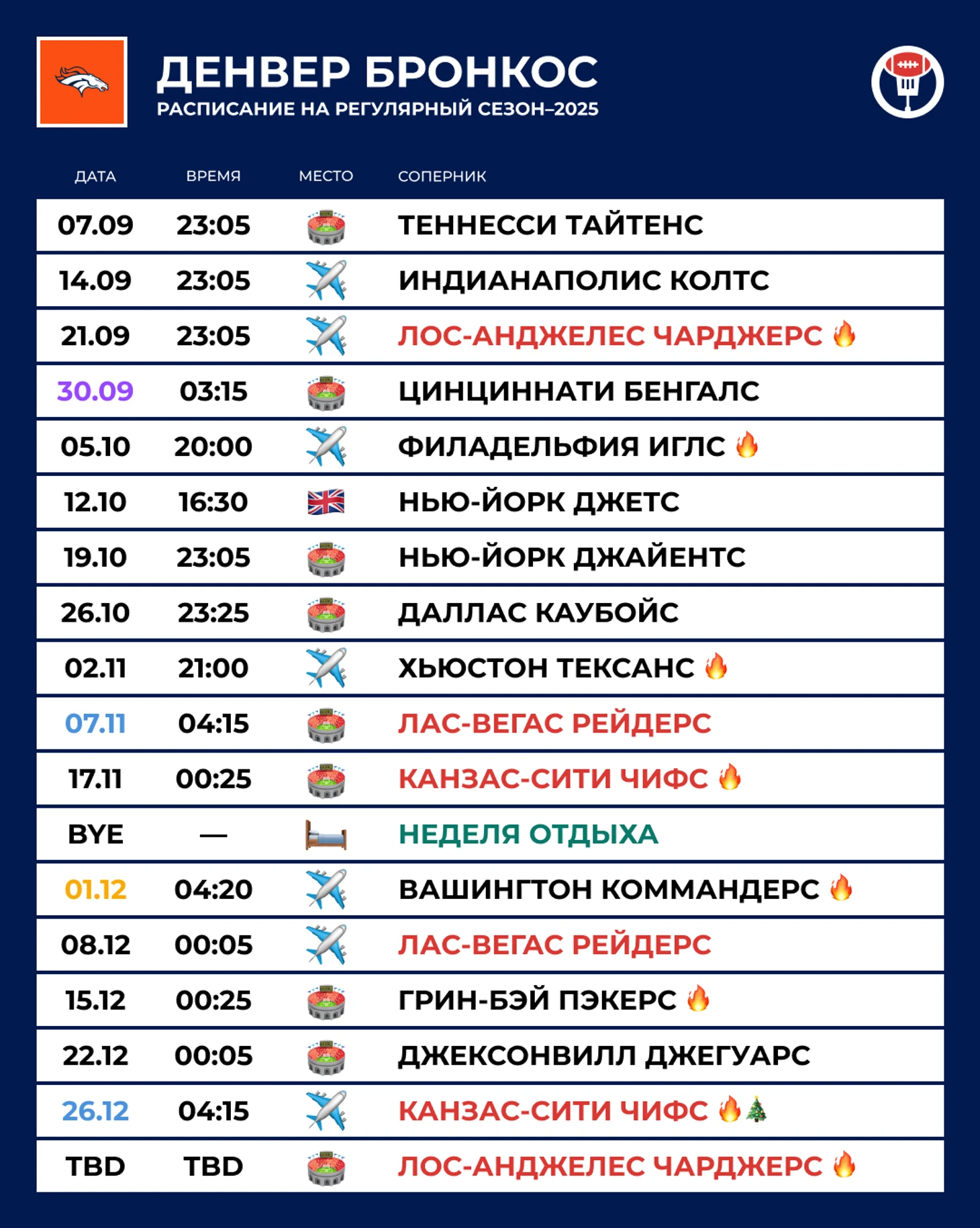 Минувшей ночью НФЛ опубликовала расписание на регулярный сезон–2025. «Тейлгейт» создал карточки для каждой из 32 команд, где время начала матчей указано по московскому времени.