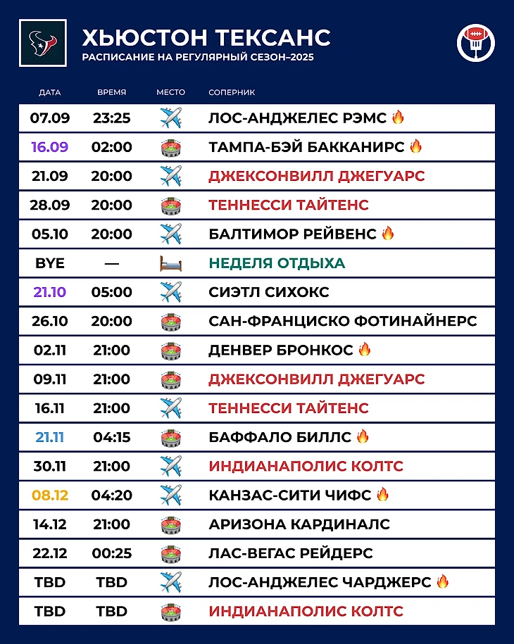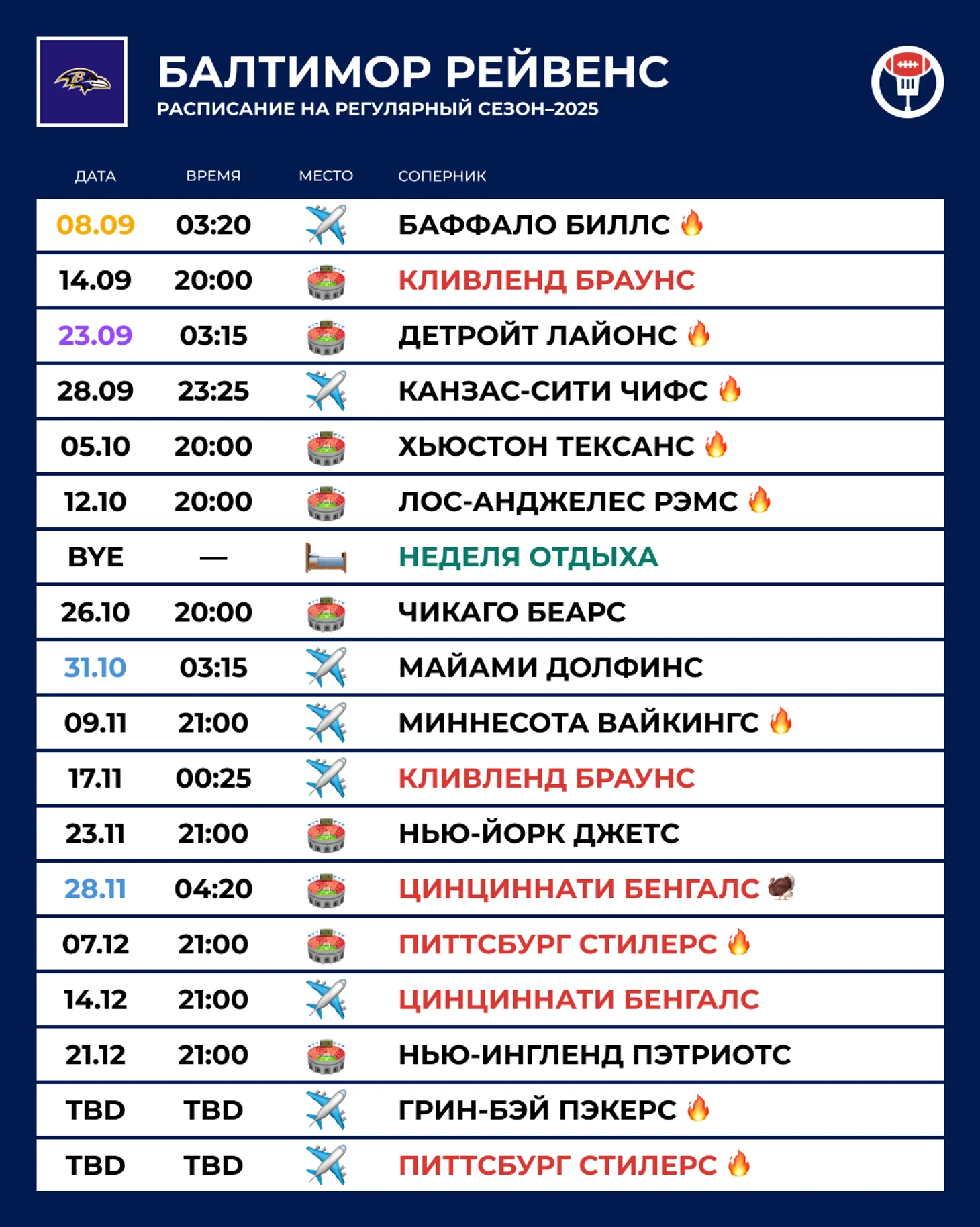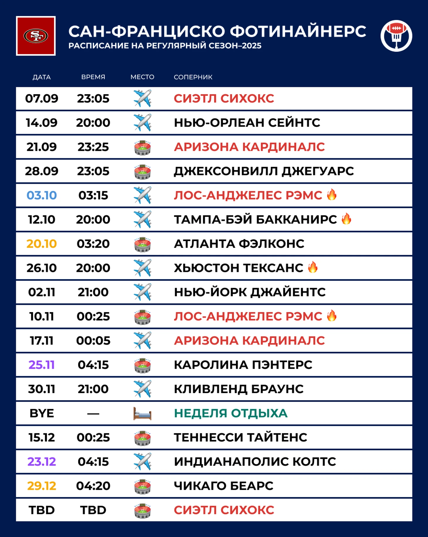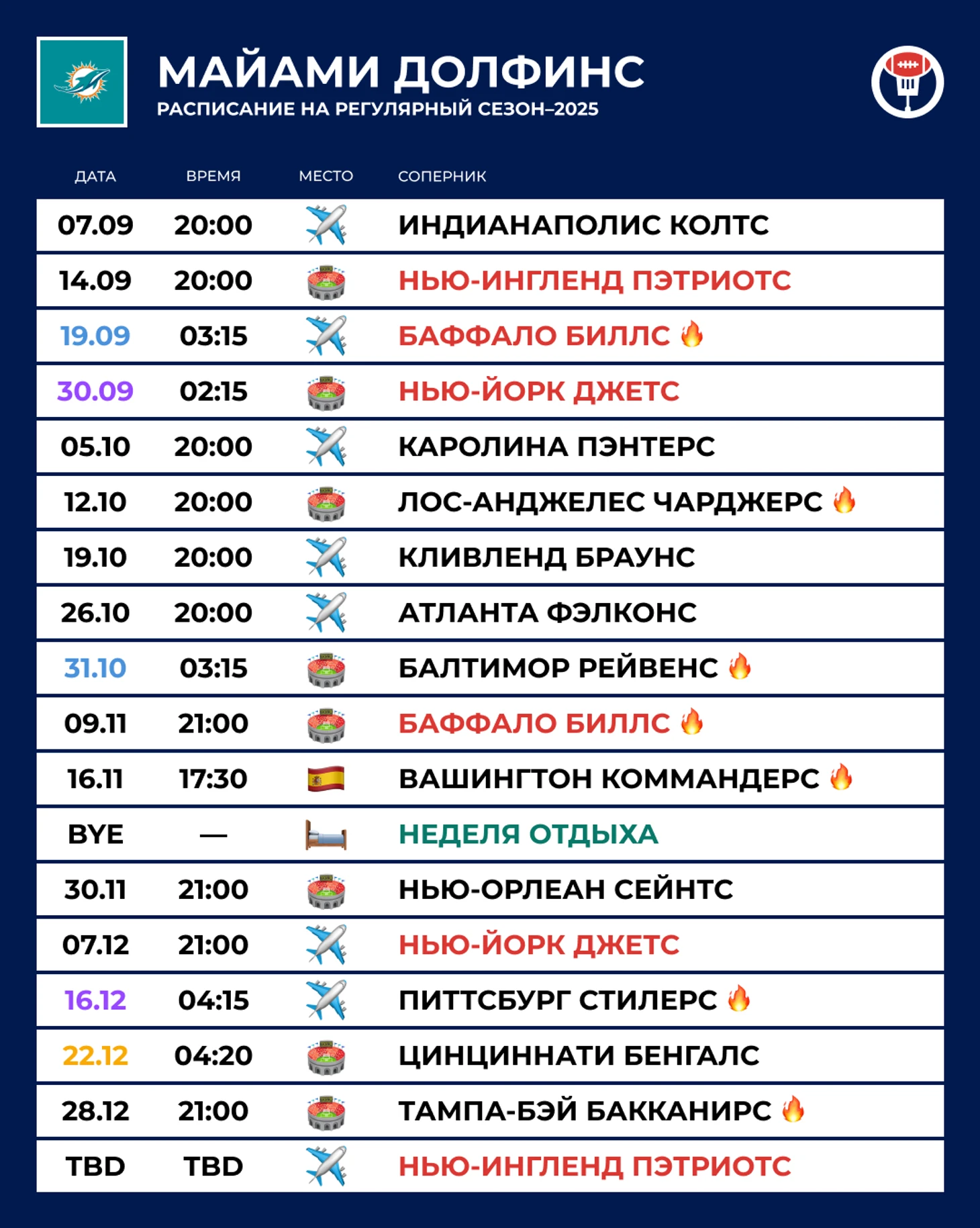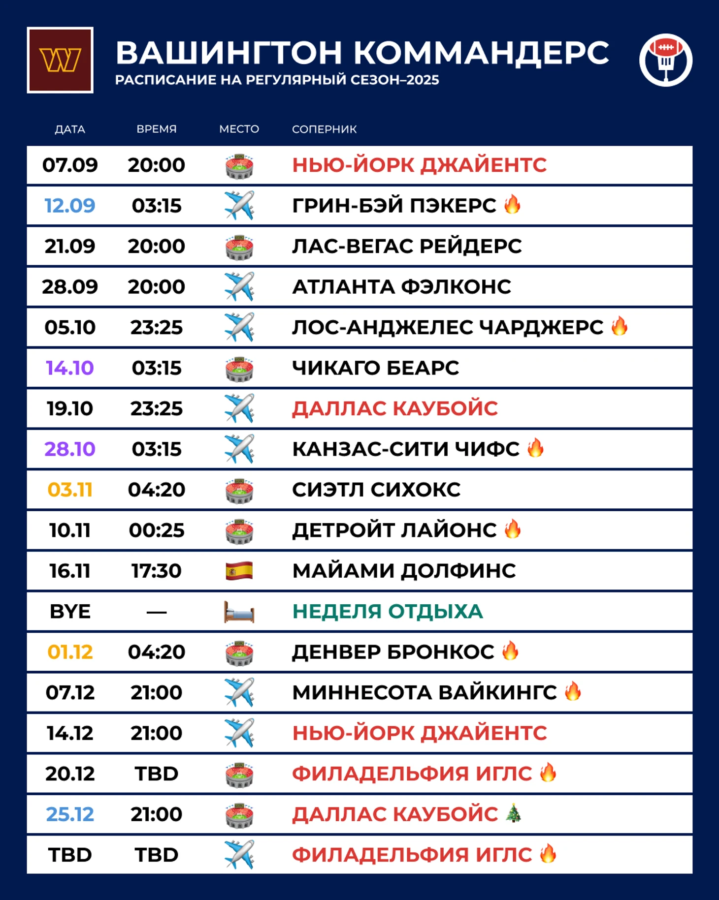 Минувшей ночью НФЛ опубликовала расписание на регулярный сезон–2025. «Тейлгейт» создал карточки для каждой из 32 команд, где время начала матчей указано по московскому времени.