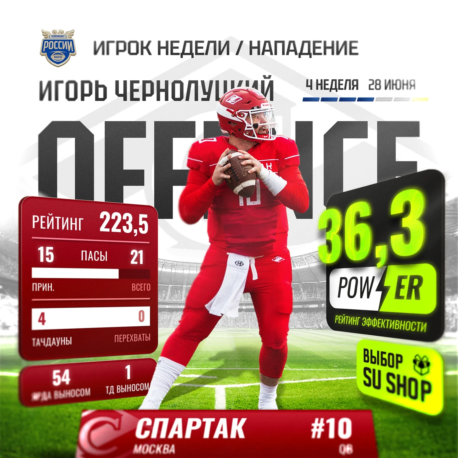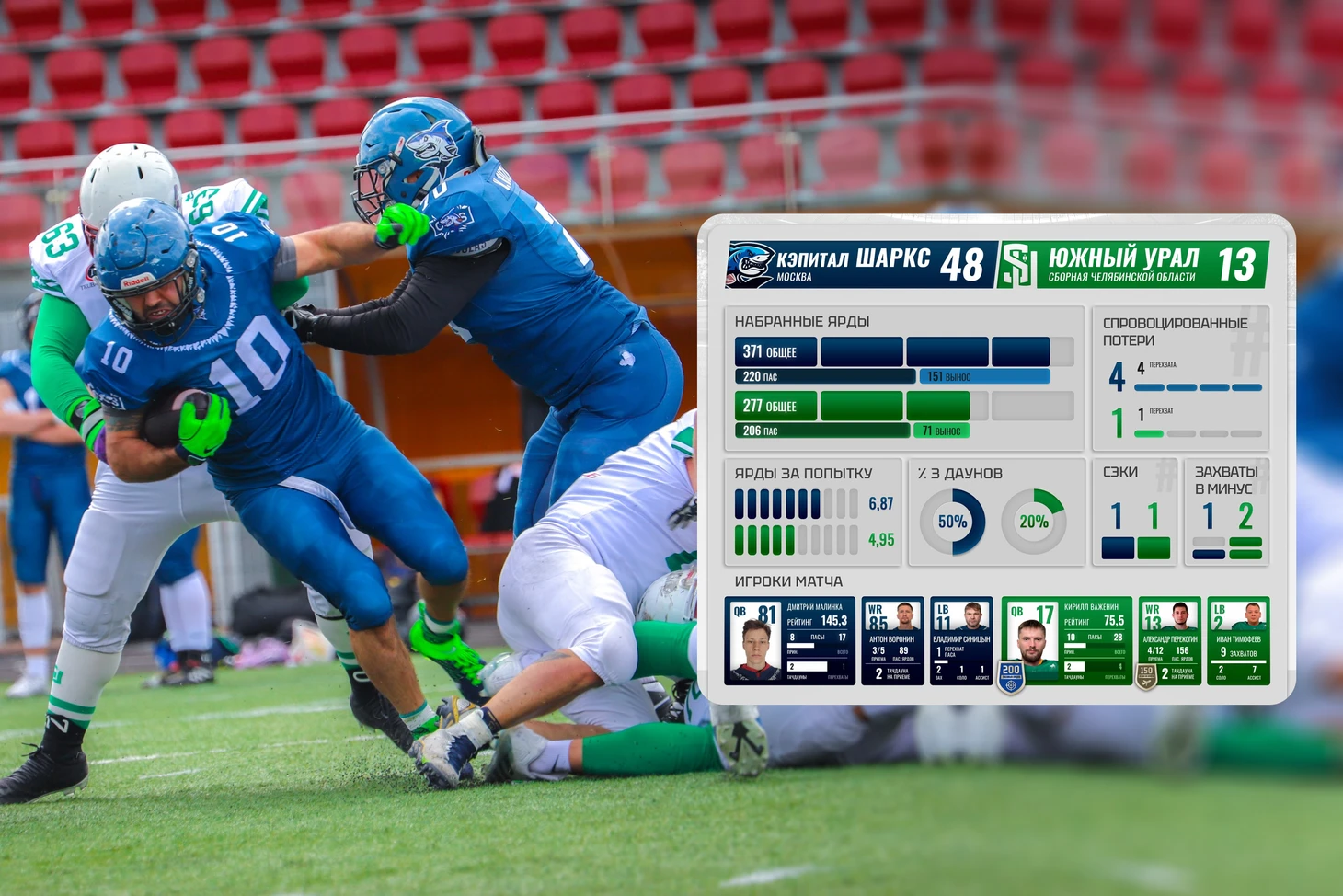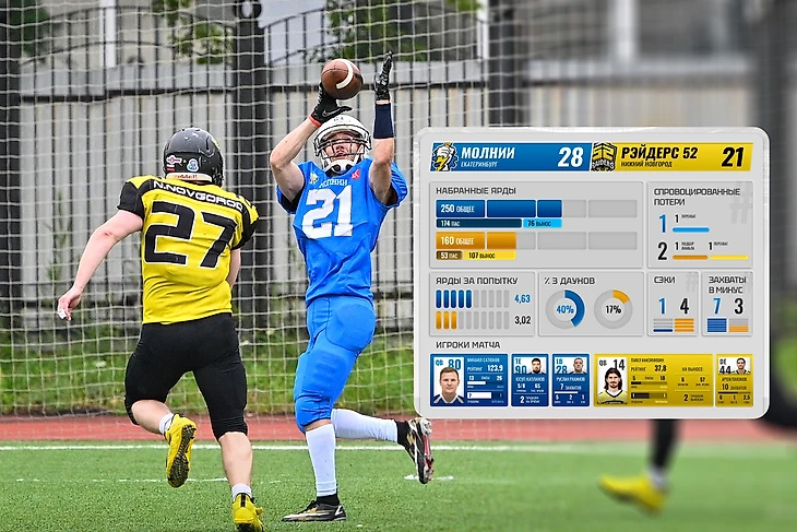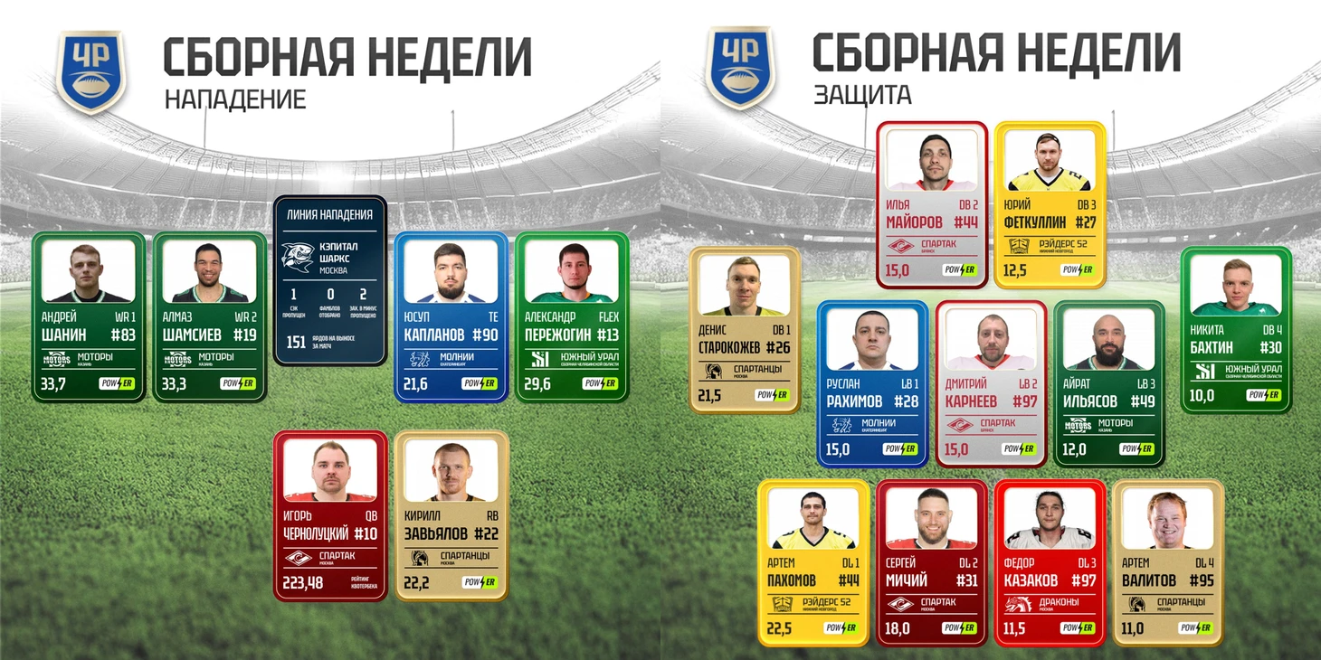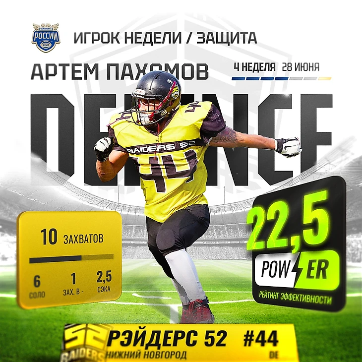 Защита «Рэйдерс 52» не стала лёгкой прогулкой для Михаила Сатюкова. Весь матч квотербека команды из Екатеринбурга преследовали линейные защиты Нижнего Новгорода. Чаще всех до Михаила добирался Артём Пахомов. Одно из самых ярких индивидуальных противостояний этой недели.