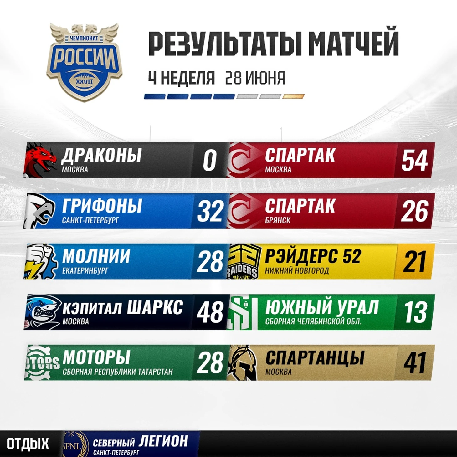 «Грифонам» с сильно обновлённым составом старт сезона дался непросто, но по ходу чемпионата команда сильно прибавила в темпе: против ранее упомянутого московского «Спартака» питерский клуб смог показать достойную игру, а уже против Брянска даже победить. Наперекор всем сложностям, которые возникали по ходу матча: к примеру, роль основного бегущего вместо мексиканского легионера по старой памяти снова занял Андрей Мансуров, до этого заявленный как линейный. И не зря переодел джерси — 2 тачдауна в таком низовом матче — на вес золота!
