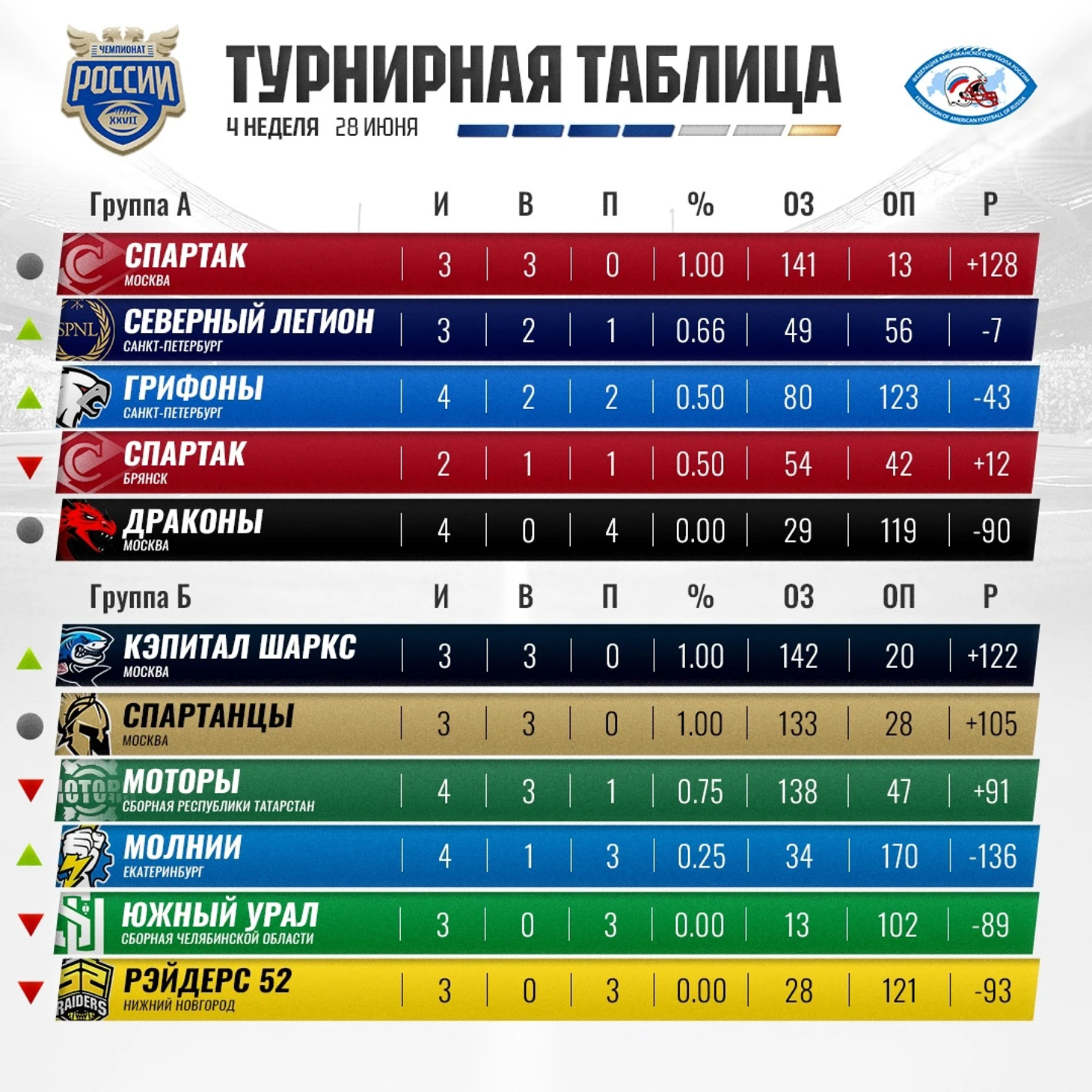 В группе Б тем временем распределение команд по местам в турнирной таблице также приходит в движение — «Спартанцы», одержавшие победу над «Моторами» на выезде, остаются на второй строчке, но отправляют команду из Казани с первого сразу на третье место. «Кэпитал Шаркс» занимают освободившееся место лидера: на этой неделе в их активы добавилась ещё одна уверенная победа против уральской команды, как и неделю назад. Что примечательно: «Южный Урал» заработал свои первые очки в нападении в этом сезоне, теперь в графе ОЗ не так пусто, и это хорошо. «Молнии» берут вверх над «Рэйдерс 52» и поднимаются с последнего места сразу на четвертое. Впереди у команды из Екатеринбурга уральское дерби против «Южного Урала». Для команды из Челябинска — это шанс получить первую победу в сезоне, но, если что-то не получится, можно будет этот шанс получить уже против «Рэйдерс 52» так же на выезде. Для «Молний» — это возможность завершить сезон на мажорной ноте и окончательно зафиксировать своё текущее место в турнирной таблице, по сути решив все свои принципиальные задачи на сезон. «Шаркс» дома сразятся с «Моторами» за выход в плей-офф.
