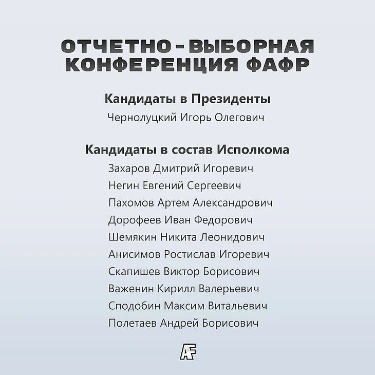 После подсчета голосов состав нового Исполкома ФАФР выглядит следующим образом: