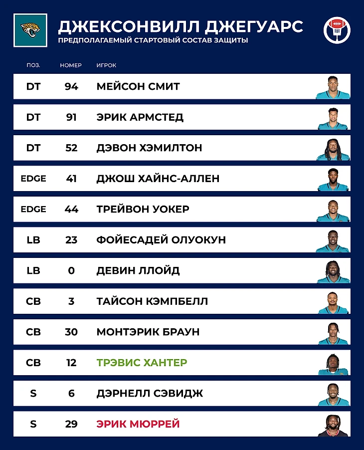 ⏪ Прошлый год: 4–13. В 2022 году команду возглавил Даг Педерсон, и показалось, впервые за долгое время наметился устойчивый рост — «Джегуарс» целых два сезона подряд заканчивали с положительным балансом побед и поражений, чего не случалось с 2005 года. Но тут последовал резкий обвал — уже к 10-му туру «Джексонвилл» потерпел столько же поражений, сколько за весь предыдущий сезон. По итогам сезона владелец Шед Хан уволил не только Педерсона, но даже казавшегося бессмертным генменеджера Трента Балки. Что самое страшное, не было какой-то одной понятной причины спада. Даже травмы ключевых игроков произошли уже после того, как «Джексонвилл» обеспечил себе сезон без плей-офф.