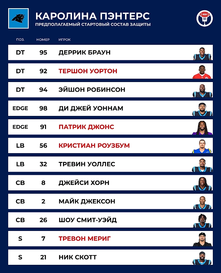 DE Деррик Браун — смог попасть в Матч звёзд по итогам ужасного для «Каролины» сезона–2023, но после подписания $96-миллионного контракта пропустил почти весь прошлый сезон из-за травмы мениска.