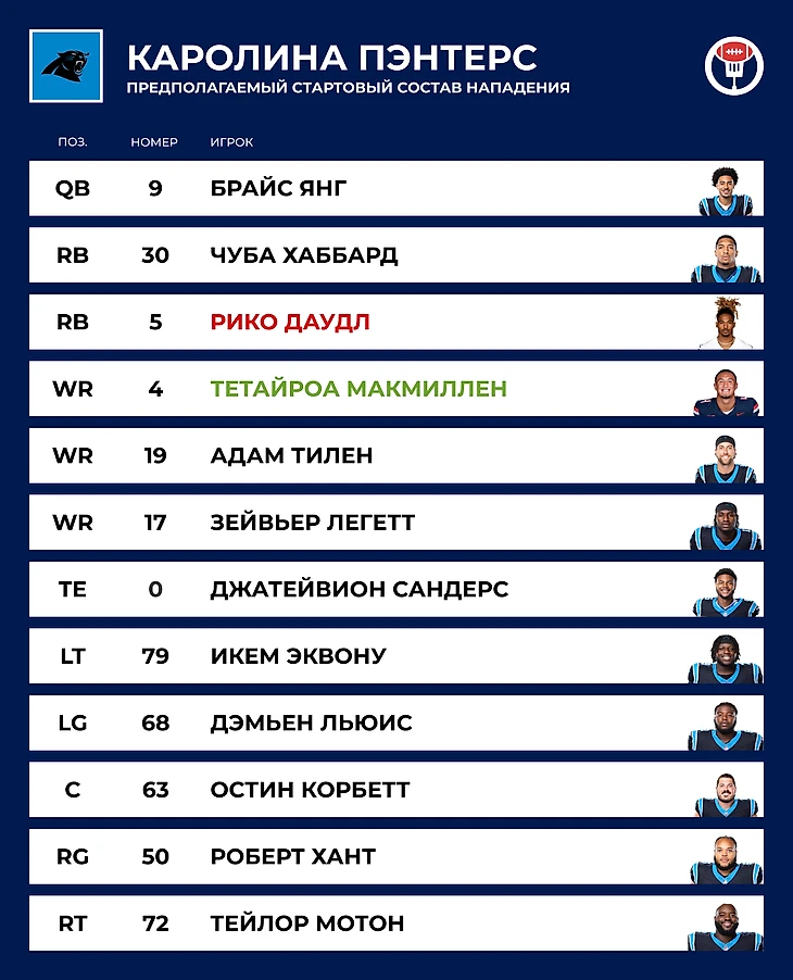 🃏 Козырь: Неожиданно, но нападение. С авансом, но всё же: Янг реабилитировался, пришёл Макмиллен, здоров Тилен, за прошлый сезон расцвёл незадрафтованный ресивер Джейлен Кокер. В корпусе бегущих помимо классного Чубы Хаббарда теперь есть подписанный за копейки Рико Даудл. Если линия нападения будет играть хотя бы средне, то это должно быть живое и интересное нападение.