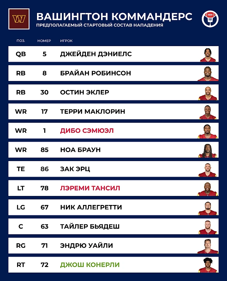 ⏪ Прошлый год: 12–5 и выход в финал конференции. Главная сенсация и открытие сезона. Прибавили аж 8 побед в сравнении с предыдущим сезоном, совершили несколько эпичных камбэков (включая хэйл-мэри в игре с «Чикаго»), нанесли «Филадельфии» единственное поражение за 16 матчей (от 6-го тура до Супербоула включительно) и на выезде выкинули из плей-офф «Тампа-Бэй» и «Детройт» последовательно. В общем, сделали американский футбол снова великим в столице США спустя десятилетия мрака.