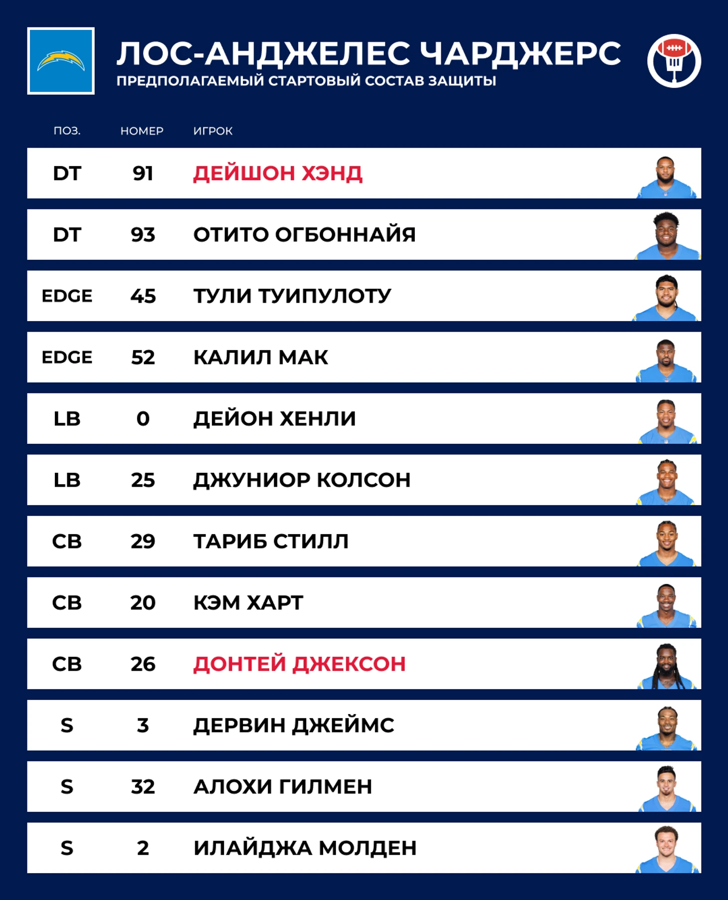 🦶 Слабость: Глубина защиты. По сравнению с эпохой тренера Брэндона Стейли, защита «Чарджерс» прибавила в прошлом году, но уж очень низкой была планка. Сейчас перед командой Джима Харбо стоят другие задачи, и я не уверен, что персонал в защите к ним готов. Линия защиты — откровенно слабое звено. С корнербеками координатор Джесси Минтер в прошлом году прыгнул выше головы. Корпус эджей можно было и усилить, учитывая возраст Мака.