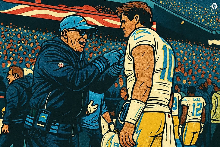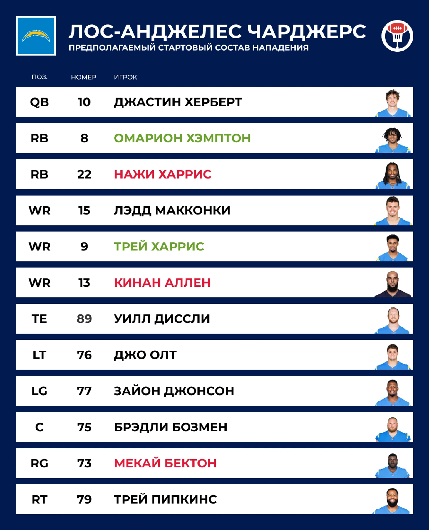 ⏪ Прошлый год: 11–6 и поражение в раунде уайлд-кард. «Чарджерс» после назначения Джима Харбо оправдали все ожидания — тяжёлые построения, акцент на вынос и дисциплину, резко прибавившая защита, положительный результат в первый же год. Позитивный сезон завершился неприятным конфузом в плей-офф, когда Джастин Херберт бросил 4 перехвата, и «Чарджерс» проиграли «Хьюстону» 12:32.
