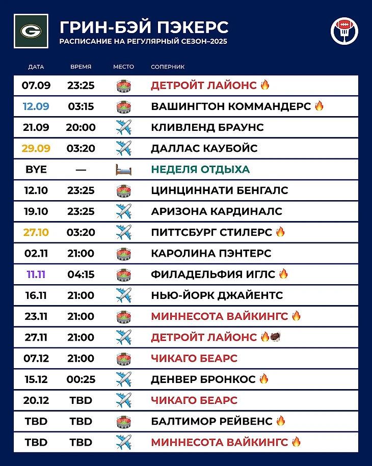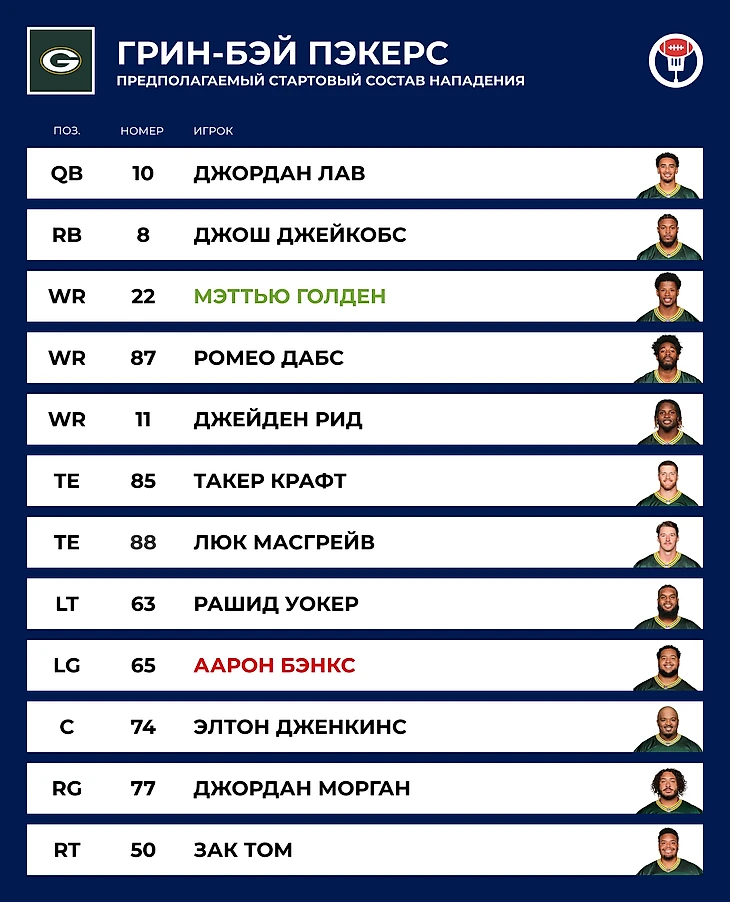 ⏪ Прошлый год: 11–6 и поражение в раунде уайлд-кард. «Пэкерс» в прошлом сезоне были одной из самых понятных в плане результатов команд — они были сильнее всех, кроме «Филадельфии» и соперников по дивизиону. Из шести поражений пять от команд Севера НФК, причём четыре из них в одно владение. Закольцевал «Грин-Бэй» сезон поражением от «Филадельфии» в первом раунде плей-офф — им же уступили в первом матче регулярки, который прошёл в Бразилии.