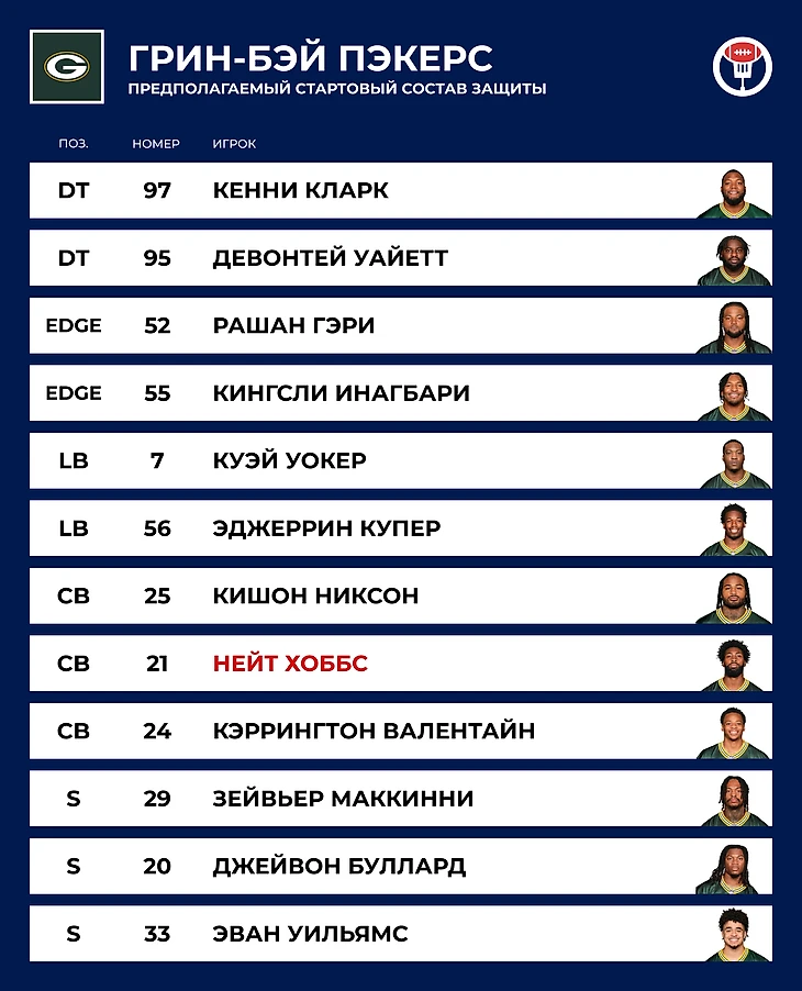 🦶 Слабость: Корнербеки. Обычно мы говорим об «игре в прикрытии» всего корпуса ди-беков, но у «Пэкерс» это разбалансированный юнит. Помимо Джаира Александра клуб покинул ещё и Эрик Стоукс. На замену взяли Нейта Хоббса, который с Александром потягается в одном — в числе матчей, пропущенных из-за травм. Никсон, Валлентайн, новичок из седьмого раунда Майка Робинсон — может, кто-то и заиграет, но корпус корнеров выглядит беднее, чем год назад.