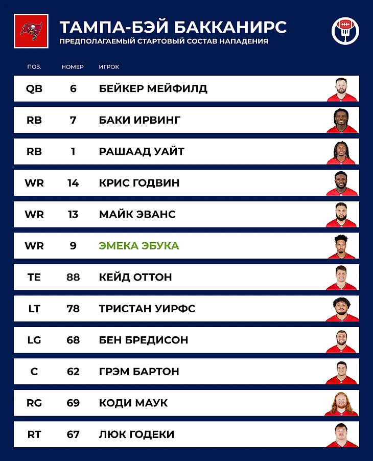 🤝 Находка: WR Эмека Эбука. Ресивер из «Огайо Стейт», выбранный в первом раунде драфта. Получил кучу комплиментов от одноклубников во время сборов. Должен проявить себя сразу же, поскольку 29-летний Годвин начнёт сезон с травмой, а Майку Эвансу уже 32 года.