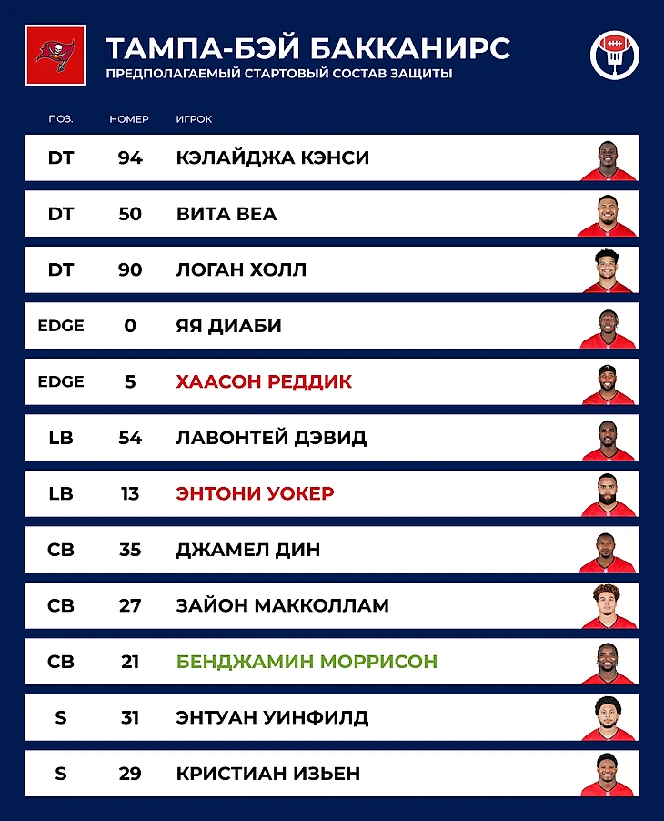 🦶 Слабость: Эдж-рашеры. С ди-тэклами у «Тампы» полный порядок, а вот с давлением с краёв могло быть и получше. Хаасон Реддик, сделавший один сэк за 10 матчей в прошлом сезоне, то ещё усиление. Яя Диаби скорее пахарь, чем сэк-машина. За ними только молодёжь.