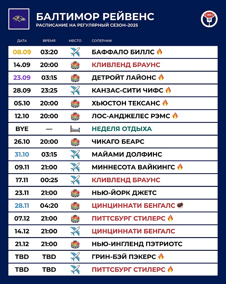 ⏪ Прошлый год: 12–5 и поражение в дивизионном раунде. Самым сложным для «Балтимора» в прошлой регулярке было противостоять андердогам с сильной защитой — фриковатые поражения от «Рейдерс» (23:26) и «Браунс» (24:29) откинули команду с верхних посевов в конференции и заставили ехать в Баффало в плей-офф. Ламар Джексон убедительно смотрелся в матчах на вылет, но в решающий момент игры с «Биллс» тайт-энд Марк Эндрюс совершил дроп во время двухочковой реализации, и на этом сезон был окончен.