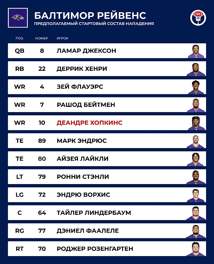 🤝 Находка: WR Диандре Хопкинс. Один из самых мастеровитых ресиверов своего поколения продолжает на закате карьеры гоняться за чемпионским перстнем. В прошлом году пробовал за «Чифс», но не получилось. Теперь станет дополнением к пасовому нападению «Балтимора». Иметь такого парня третьим ресивером — просто мечта. Теперь двухочковые реализации будут разыгрываться только в его сторону.
