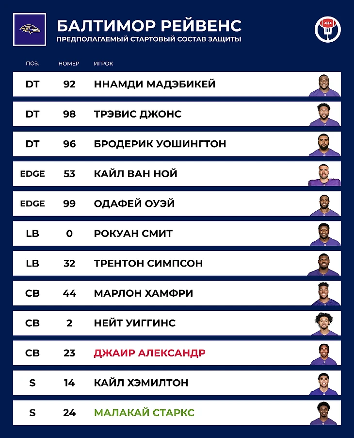 👋 Потеря: K Джастин Такер. Последний в составе, кто застал победу «Балтимора» в Супербоуле XLVII. Всю карьеру был одним из лучших кикеров НФЛ, а в прошлом году внезапно стал мазать каждый второй удар. Падение просто эпического масштаба. Потом выяснилось, что Такера обвиняют в непристойном поведении целый ряд массажисток. Мол, кикер с оперным голосом дешонил аж с дебютного сезона в лиге. В результате был бесславно отчислен и заменён новичком Тайлером Лупом.