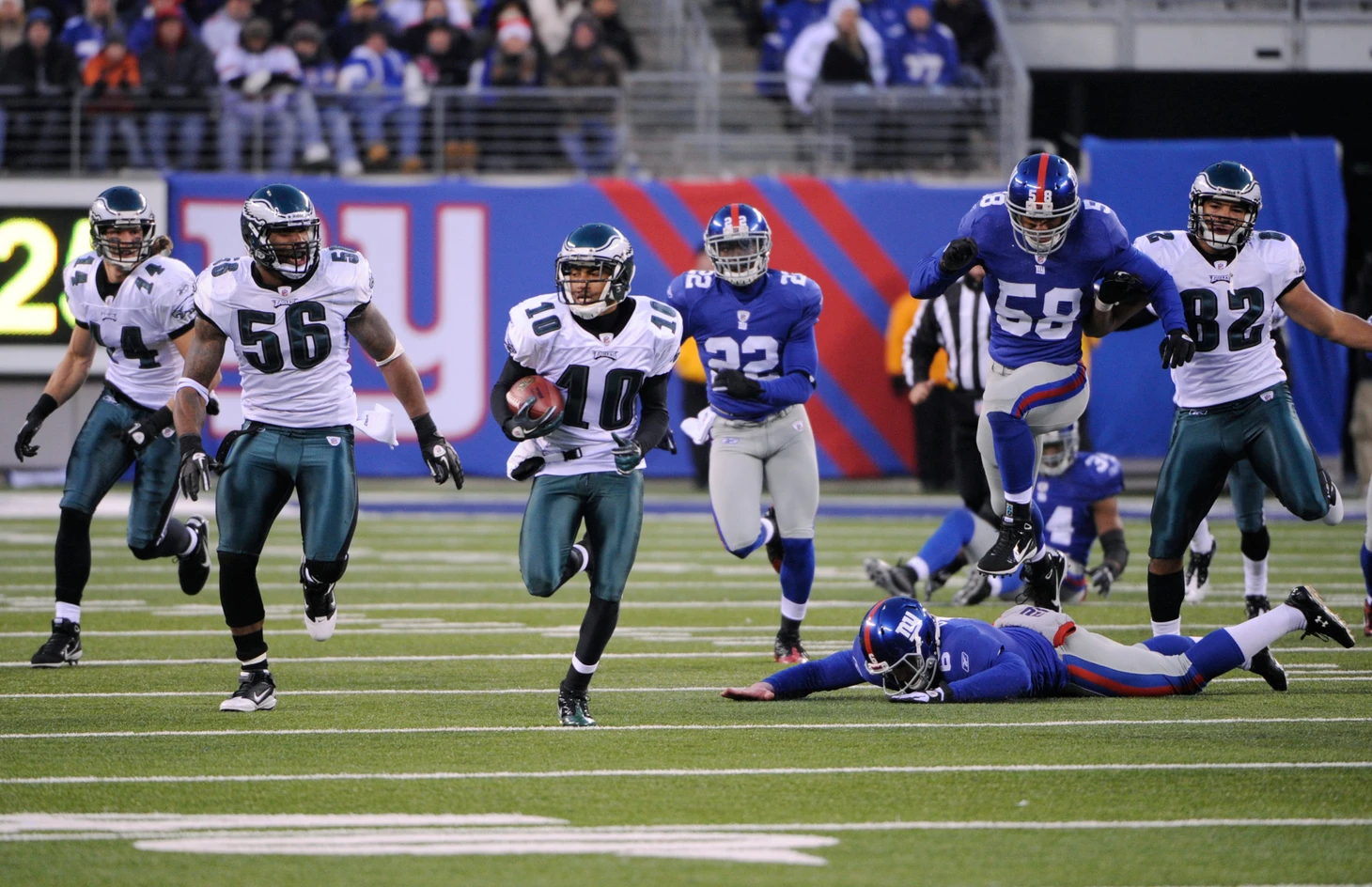 И, пожалуй, у него был лучший день в том декабре 2010 года, когда «Джайентс» второй раз играли с «Иглз». Все говорило о том, что у «Джайентс» отличный день. Они вели 31–10 за восемь минут до конца. Эта игра, по сути, была за титул чемпиона дивизиона, и всё складывалось для «Нью-Йорка» удачно.