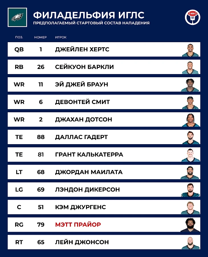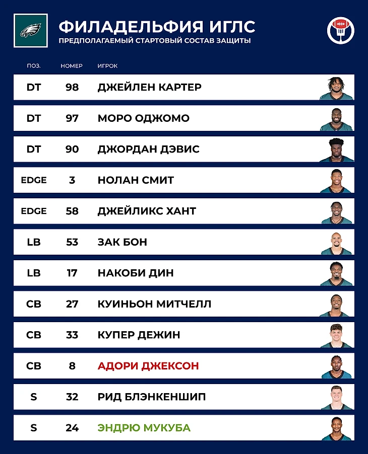 🦶 Слабость: Изменения в линиях. Раз уж зашла речь про ди-лайн и о-лайн, то здесь как раз наблюдаются тектонические сдвиги. Про обновление фронта защиты вы уже поняли, а по другую сторону мяча меня беспокоит правая сторона. Гард Мекай Бектон, которому реанимировали карьеру в «Иглс» после «Джетс», покинул клуб, и пока неясно, кто сможет его в полной мере заменить. «Филадельфия» даже решила повторить фокус и обменяла Кеньона Грина — гарда из первого раунда, не заигравшего в «Хьюстоне». Лейн Джонсон — один из лучших правых тэклов в лиге, но ему уже 35 лет. Для «Орлов» железная о-лайн — основа успеха.