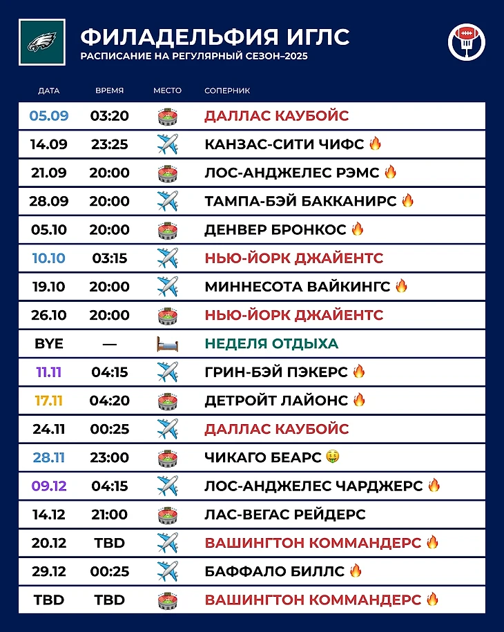 🎱 Прогноз: 13–4 и выход в финал конференции. У «Иглс» всё равно слишком много классных скилл-игроков в нападении, накопленная глубина состава в защите и грамотное руководство — супербоульное похмелье не грозит. Бэк-ту-бэк не прогнозирую, так это просто от веры в другого представителя НФК.