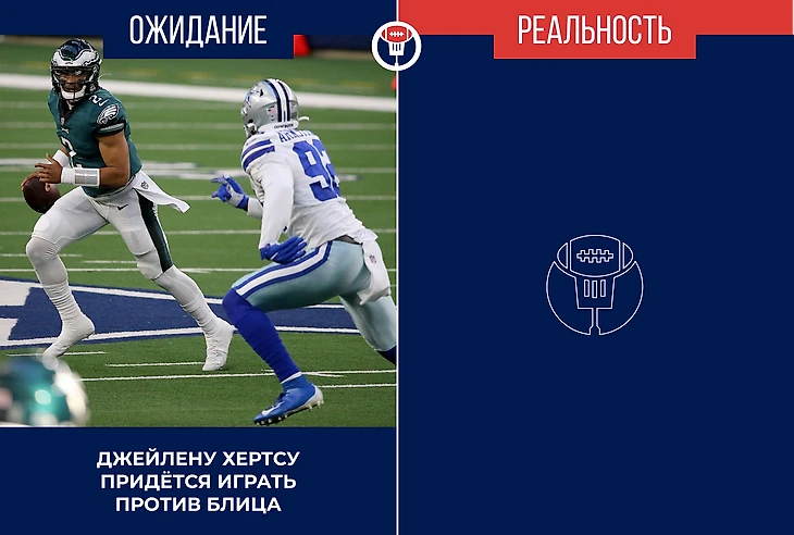 Квотербек «Филадельфии» уже встречался с защитой Мэтта Иберфлуса, хотя это и было давно — в 15-м туре сезона–2022. Тогда он бросил два перехвата и набрал всего 38,1% успешных передач из конверта (не путайте с обычным процентом точных передач, для «успешных передач», т.е. реально продвигающих мяч вперёд средняя планка по лиге 45%). В тех условиях Иберфлус постоянно использовал нулевое прикрытие и блицевал чаще, чем в любом другом матче сезона. Сейчас у него нет причин менять подход — да, Хертс значительно прибавил в игре против блица, но всё равно это не его козырь. К тому же, и сами обстоятельства подталкивают координатора защиты «Далласа» к этому.