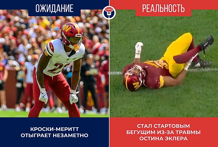 Кроски-Мерритт действительно едва появлялся на поле, но зато теперь он стартовый раннинбек команды. Остин Эклер порвал ахилл в бесконтактной ситуации и пропустит остаток сезона. Кто бы мог ещё пару месяцев назад предсказать, что парень из седьмого раунда так быстро превратится в главную надежду «Вашингтона» на выносе? Возможно, сейчас Куинн жалеет об обмене Брайана Робинсона в «Сан-Франциско». Сейчас бы пригодился.