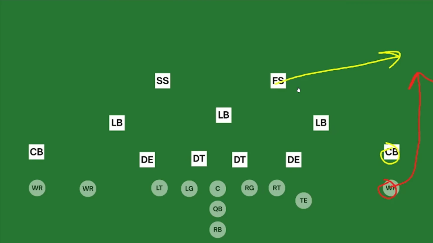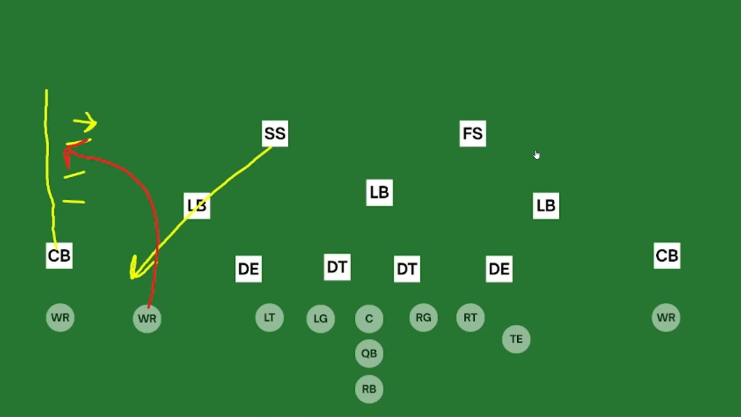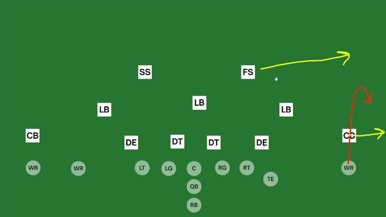 Когда сейфти спускается вниз, корнербек сохраняет внешнее преимущество (прим. пер: корнербек ближе к бровке, его тело располагается к внешнему плечу принимающему; внешнее - это к близкой бровке, на фланг, а внутреннее - от близкой бровки, то есть к центру) прежде чем подняться глубоко, позволяя защите быстро закрыть внешние бреши