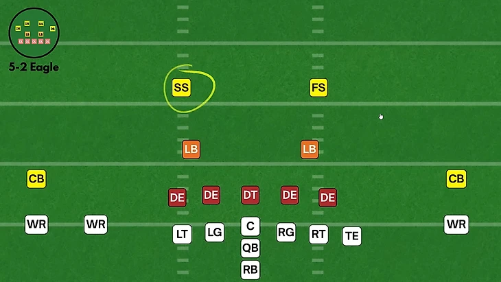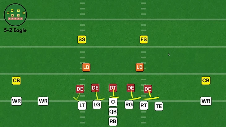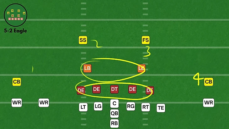 В формации 5-2 eagle у защиты на поле выходит: пять линейных, два лайнбекера и четыре ди-бека.