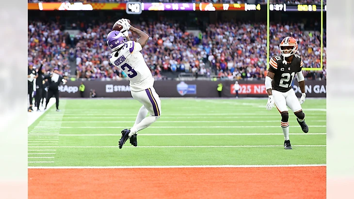 План «Миннесоты» в первой части матча заключался в том, чтобы мяч в максимально короткий временной промежуток времени покидал потные ладошки Карсона Венца. Логичный план коуча О’Коннелла, ведь за Карсоном снарядили охоту заряженные «Браунс» во главе с Майлзом Гарреттом. Избегать их захватов у Венца получалось неплохо, при таких розыгрышах мяч в основном отправлялся к Джастину Джефферсону (что логично), который в этот вечер был великолепен. В первой части матча его прикрывал Грег Ньюсом, и Джастин без шансов разделывал корнербека раз за разом. Каждый прием сопровождался фирменным трештоком, сквозь интершум проскакивало что-то там про крутые цепи и лютый свэг. Засчитано.