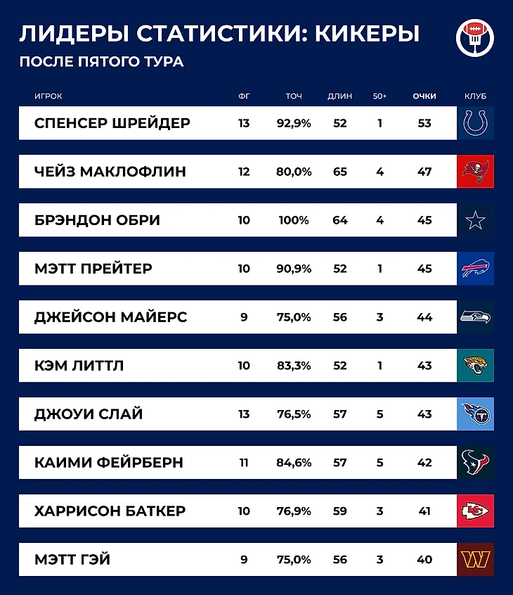 Из всех травмированных на этой неделе хочется отдельно выделить кикера «Индианаполиса». В Спенсера Шрейдера влетели во время исполнения экстра-пойнта — кикеры совершенно беззащитны в подобных ситуациях. Из-за травмы колена Шрейдер пропустит остаток сезона, а ведь он до сих пор остается лидером всей лиги по набранным очкам. «Колтс» нагружали своего кикера как ни одна другая команда — регулярно проходили до средних по меркам дальности дистанций и давали надежному Шрейдеру набрать три очка. Теперь «Инди» лишится былой стабильности по набору очков.